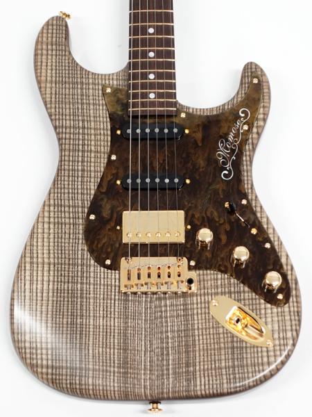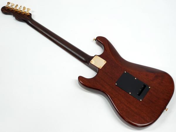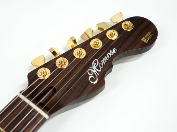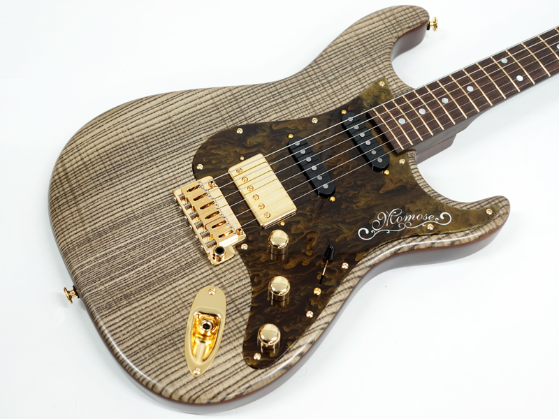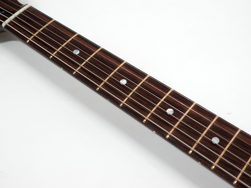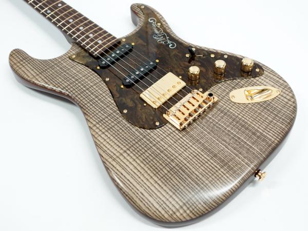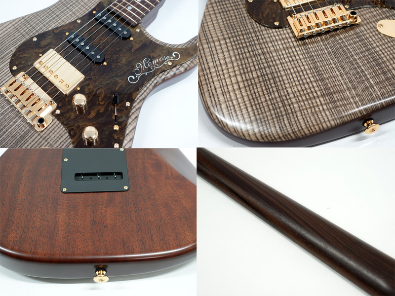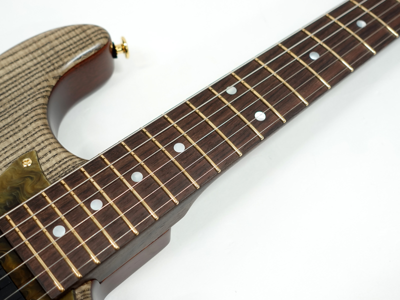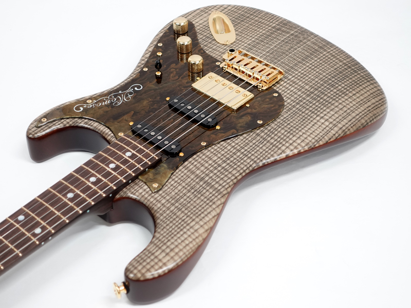 ボディトップに豪華なフレイムの出た神代タモを採用。縦に走る導管とフレイム杢のラインがさながら天然のチェック柄のように見える素晴らしいルックス。ボディバックには贅沢に1ピースのマホガニーボディ。さらにいまや良質な材料は希少となりつつあるインディアンローズウッドを贅沢にネック・指板と使用しております。非常に硬質な木材となっており、ネック・指板共に使用することで独特の粘りがあるローミッドを持ったサウンドが唯一無二の世界を生み出します。