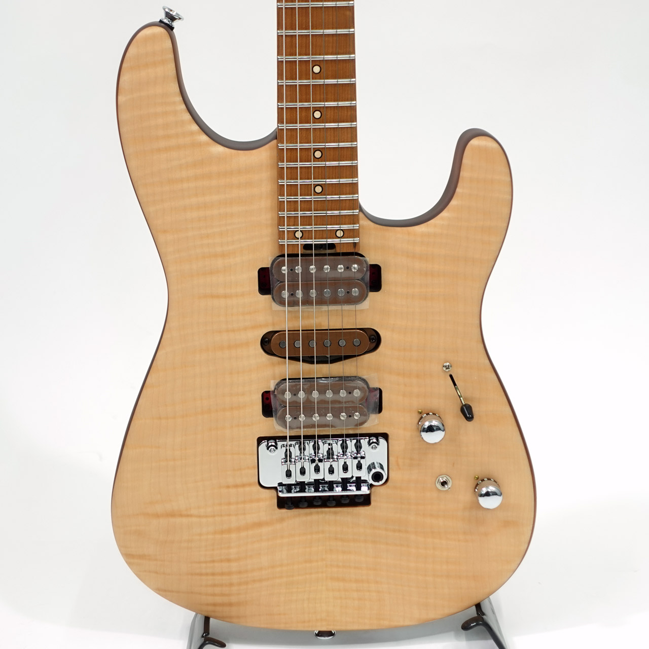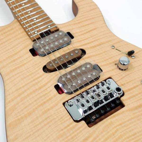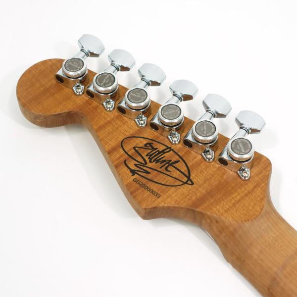 25.5インチスケールのギター、Guthrie Govan USA Signature HSH Flame Maple は、ハイポジションへも楽にアクセスできる特別なヒールカット(Sansネックプレート)加工を施され、薄いサテンウレタン仕上げの豪華なフレイムメイプルをまとった、キャラメルバスウッド製のSan Dimassボディを採用しています。