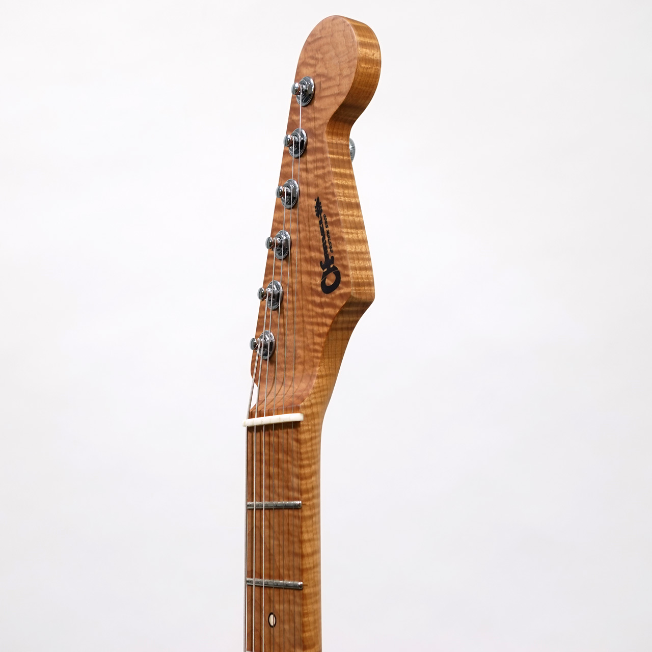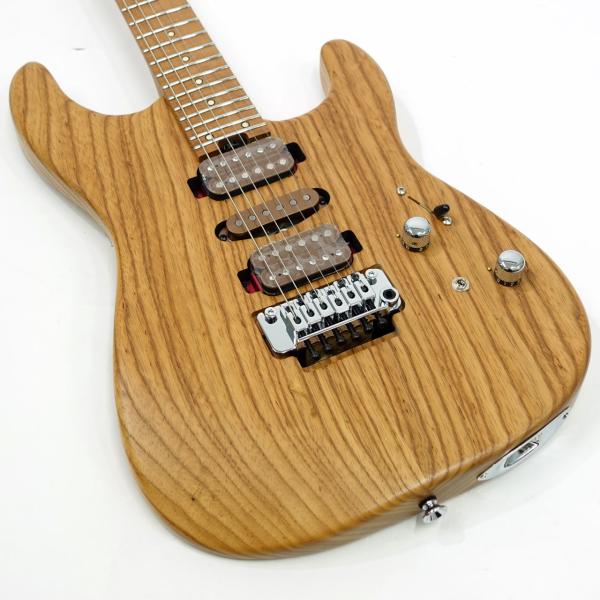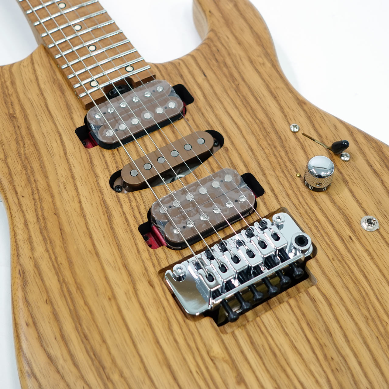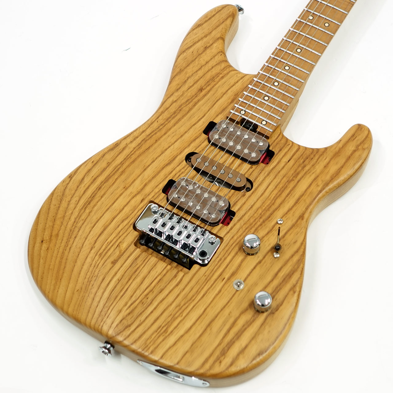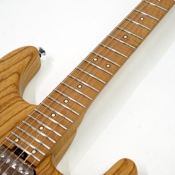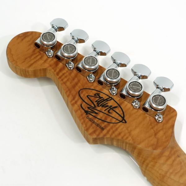 25.5インチスケールのギター、Guthrie Govan USA Signature HSH Caramelized Ash は、ハイポジションへも楽にアクセスできる特別なヒールカット(Sansネックプレート)加工を施され、薄いサテンラッカーで仕上げられた、キャラメルアッシュ製のSan Dimassボディを採用しています。ボルトオン式のフレイムメイプルネックは、グラファイト補強され、ネック背面は手作業によるウレタン仕上げに加え、ボディエンドには便利なトラスロッドアジャストメントを備えており、その「キャラメル」されたホットなサウンドは枯れた音でよく鳴るように十分に乾燥されています。San Dimassモデルでは珍しく、ネックと同じキャラメル処理された、2オクターブに渡る12〜16インチラジアス仕様のフレイムメイプル指板は、24本のエクストラジャンボステンレススティールフレットを備え、エボニーのバインディングをあしらった特別なメイプルドットインレイ、および Luminlayのサイドドットを配しており、暗いステージでも快適にプレイできます。