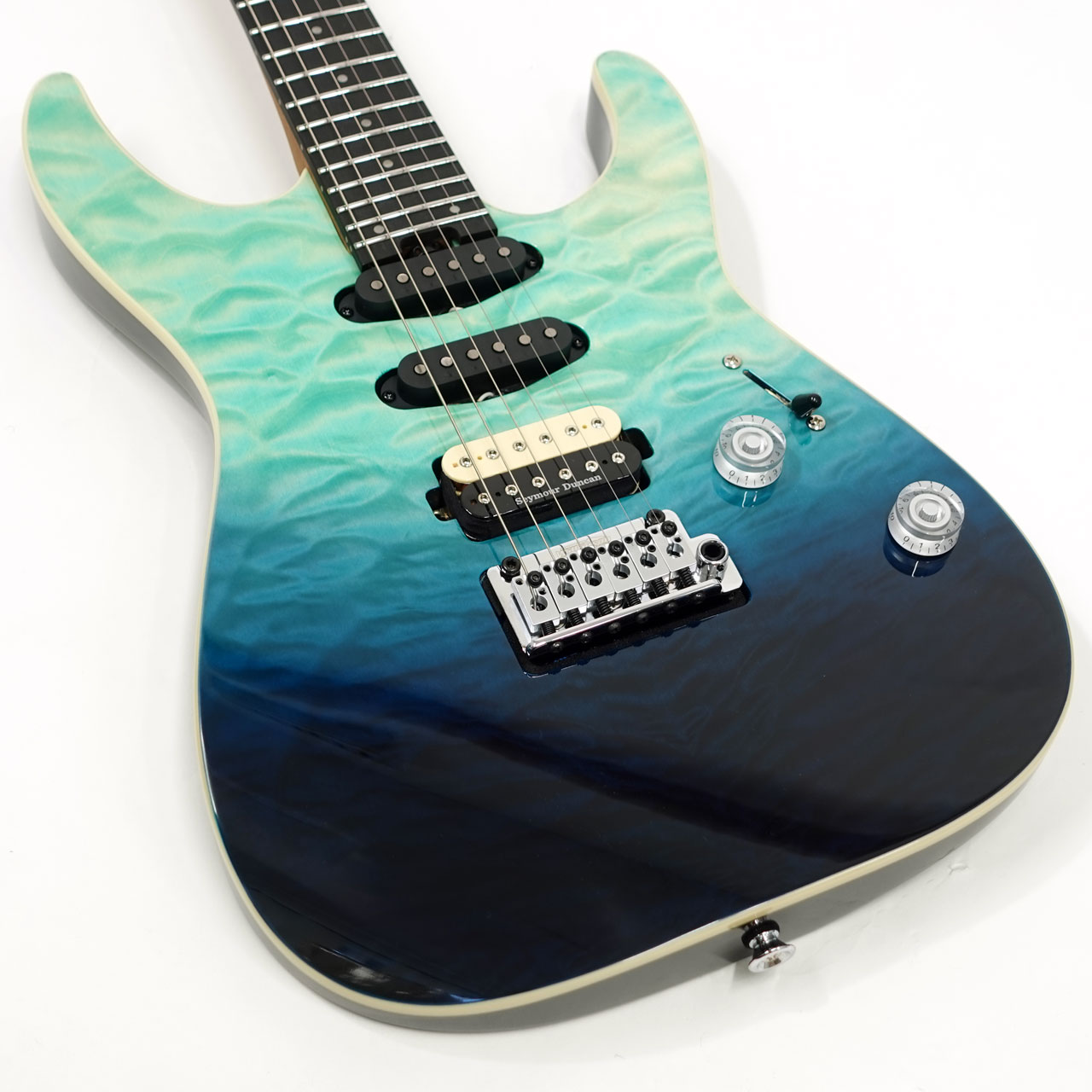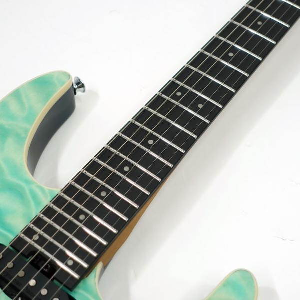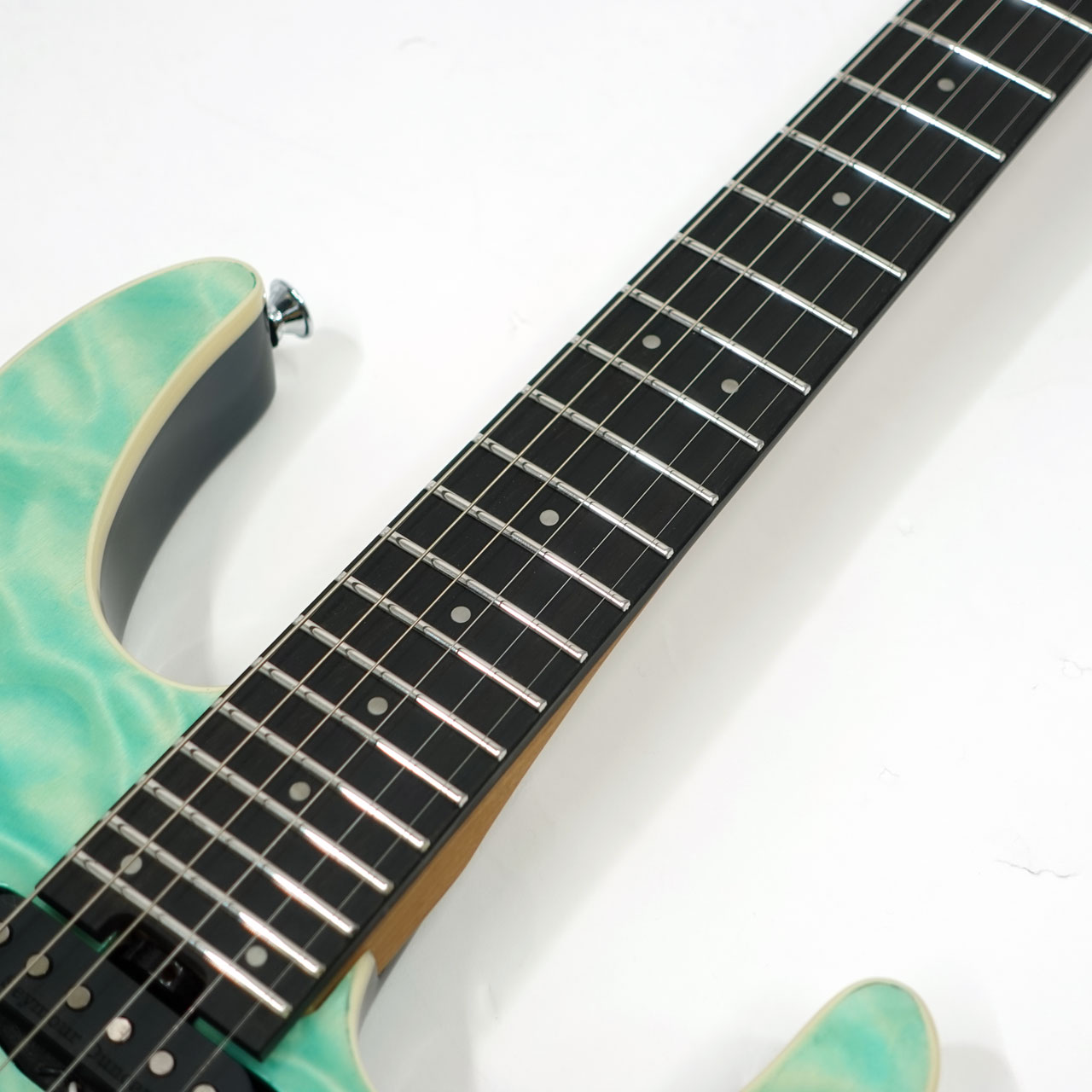 また、スピード感溢れるテクニカルなプレイをサポートする12〜16インチコンパウンドラジアスエボニー指板のエッジは丁寧にロールオフ処理されており、24本のステンレスジャンボフレット、暗いステージ上でも視認性を高める蓄光式Luminlayサイドドットを備えています。