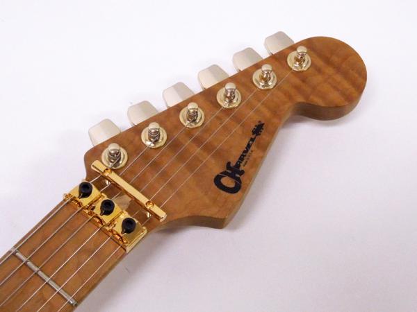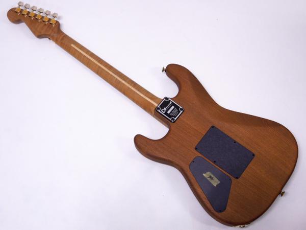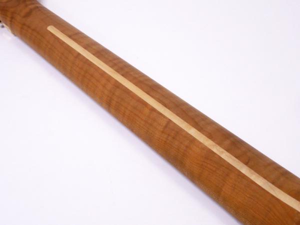 熱処理を行うことで、より安定した耐久性を発揮するクックド・ブラックアッシュボディ、こちらは柾目の材を使用し見た目にも美しさがあります。ネックは極上のフレイムメイプルを使用し、さすがのカスタムショップというクオリティです。