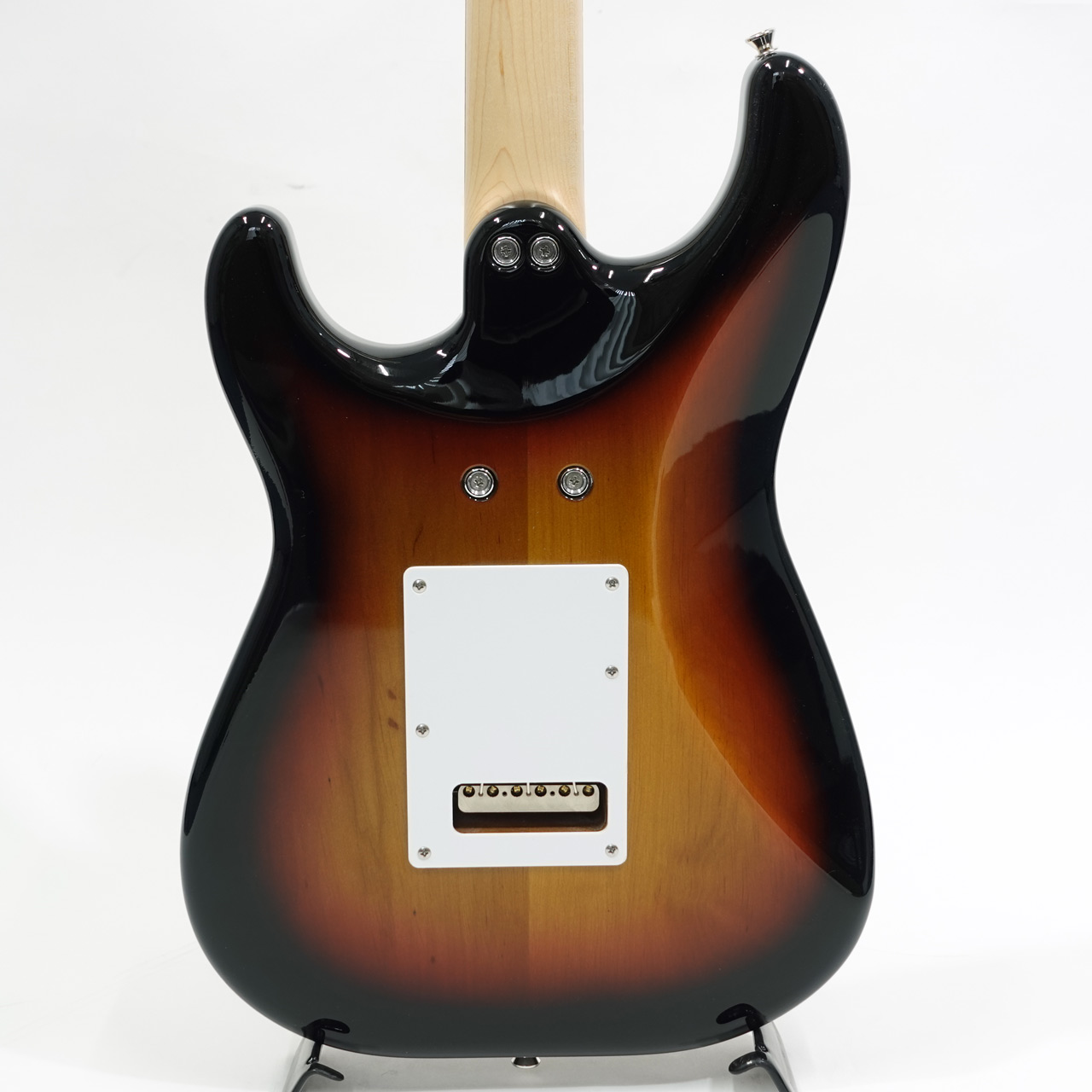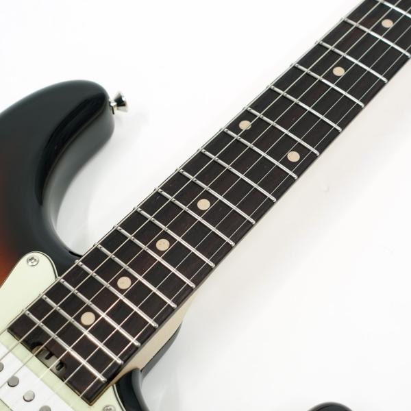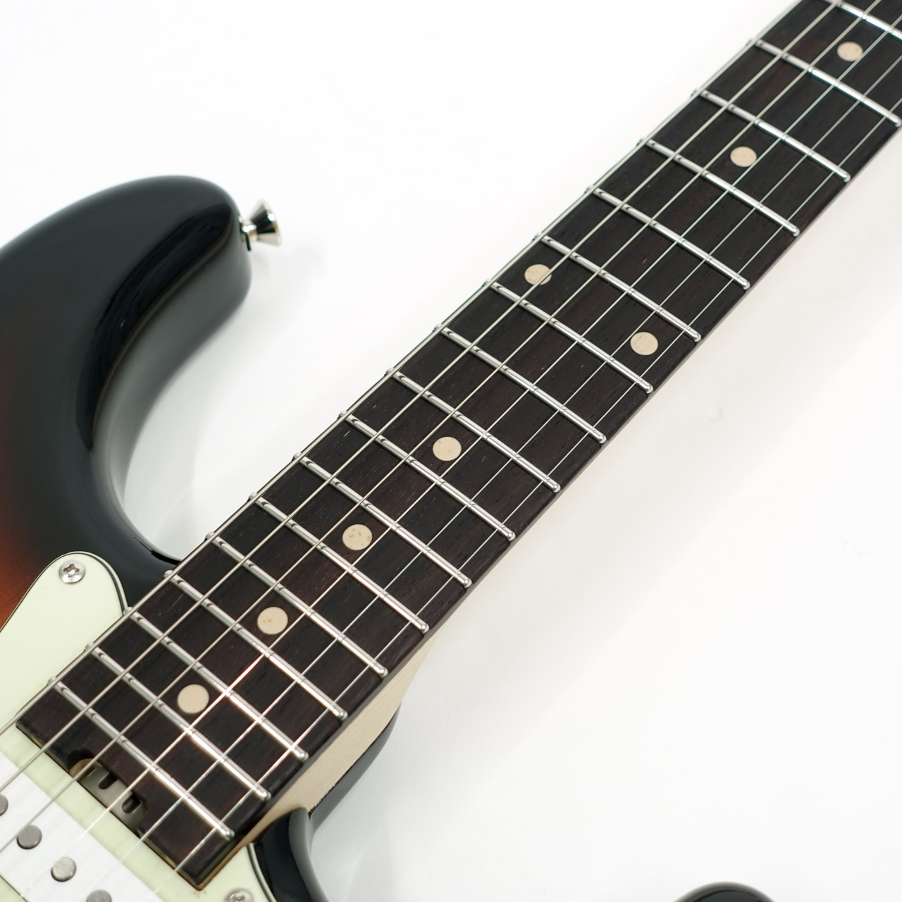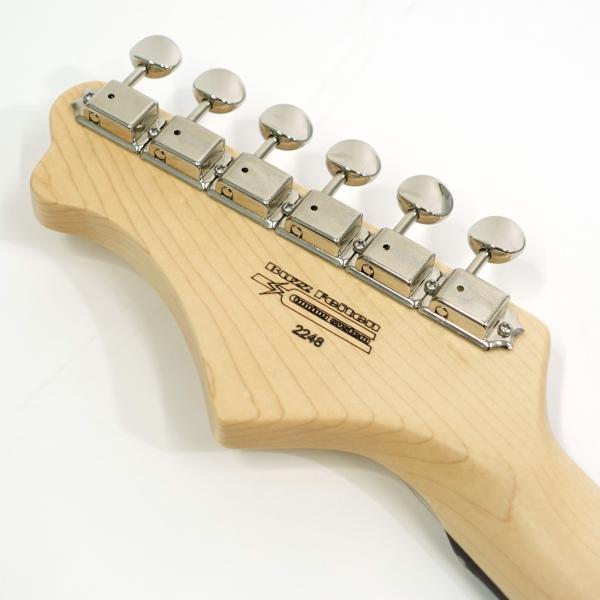 3シングルレイアウトのピックアップはブレンダーコントロールを持ち、10のフル状態で通常の3S、0へ絞っていくとフロント/センターのシリーズ、もしくはセンター/リアのシリーズ配線へと変わり疑似的なH-S-Hレイアウトとしてサウンドメイクが可能です。