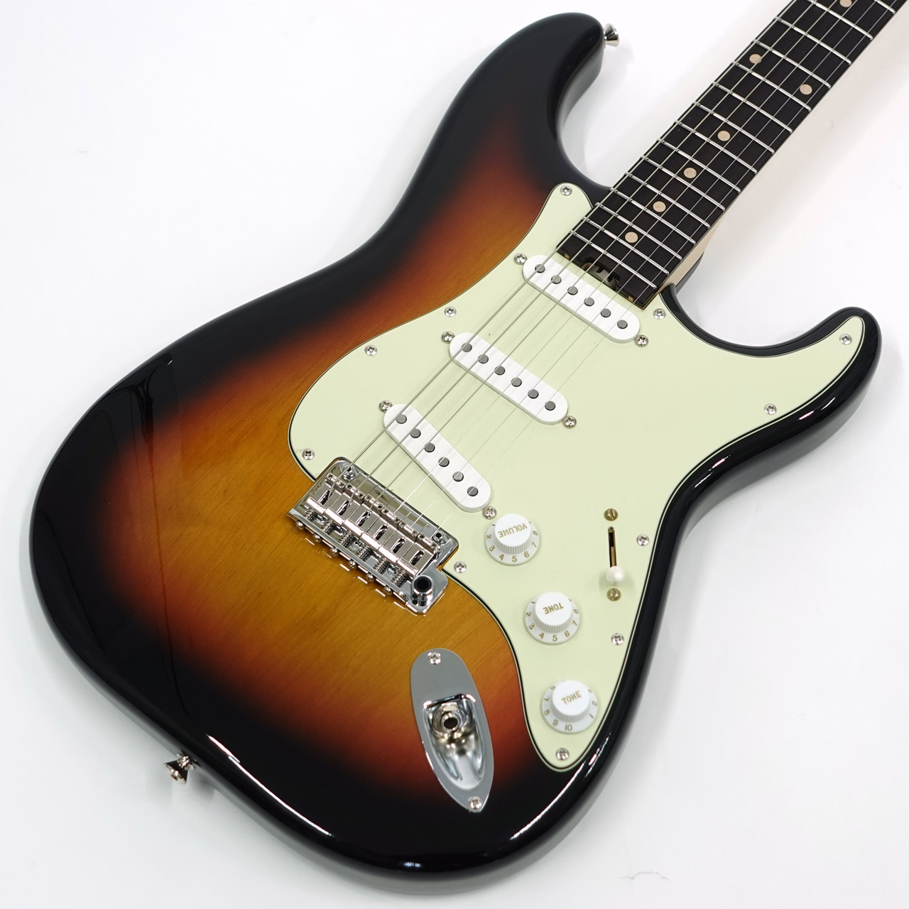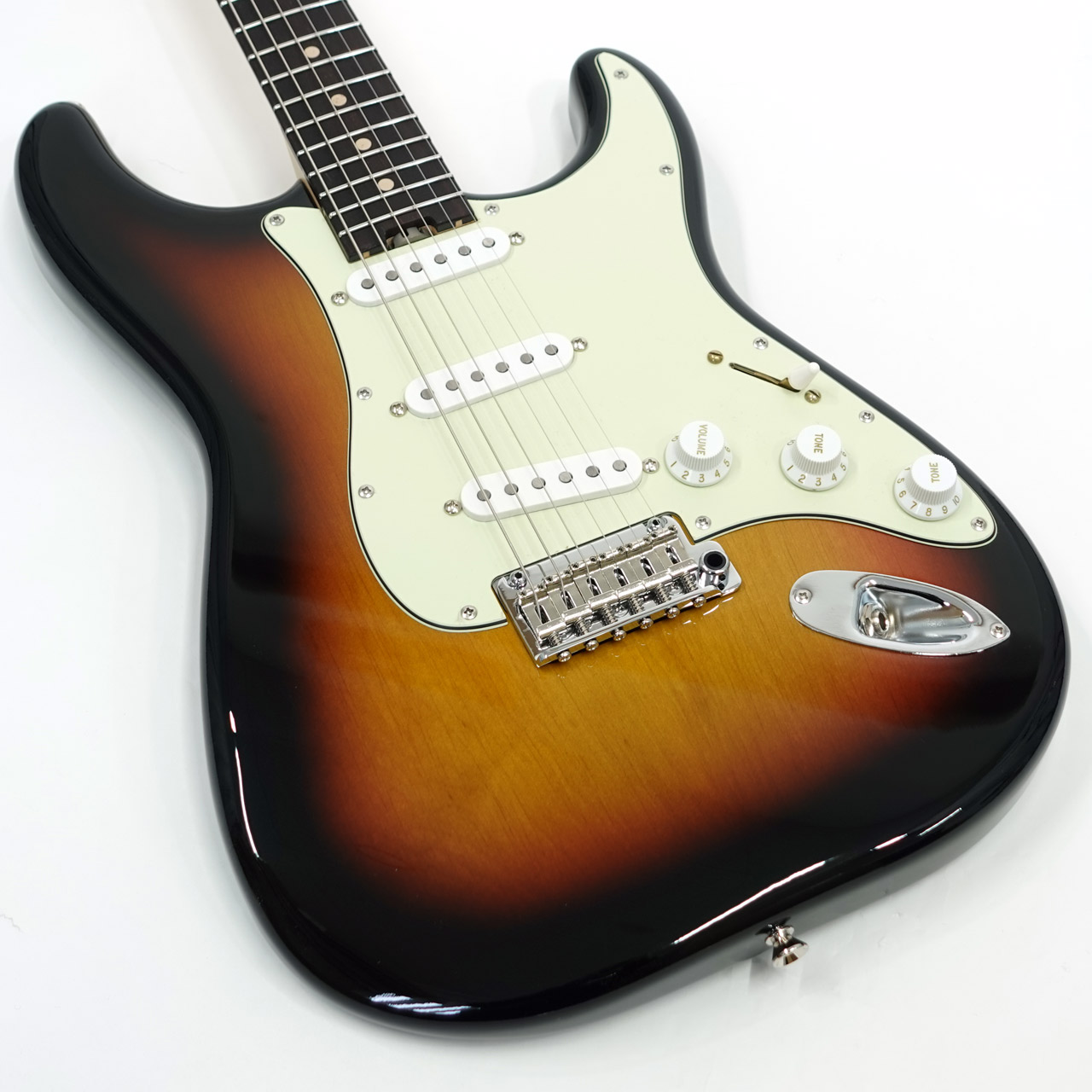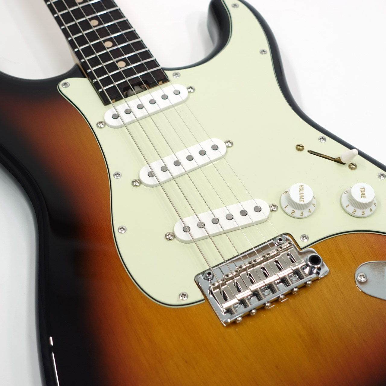 3シングルレイアウトのピックアップはブレンダーコントロールを持ち、10のフル状態で通常の3S、0へ絞っていくとフロント/センターのシリーズ、もしくはセンター/リアのシリーズ配線へと変わり疑似的なH-S-Hレイアウトとしてサウンドメイクが可能です。