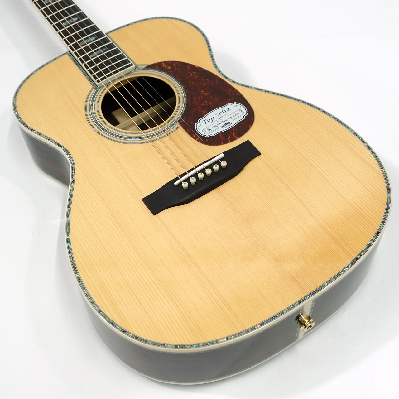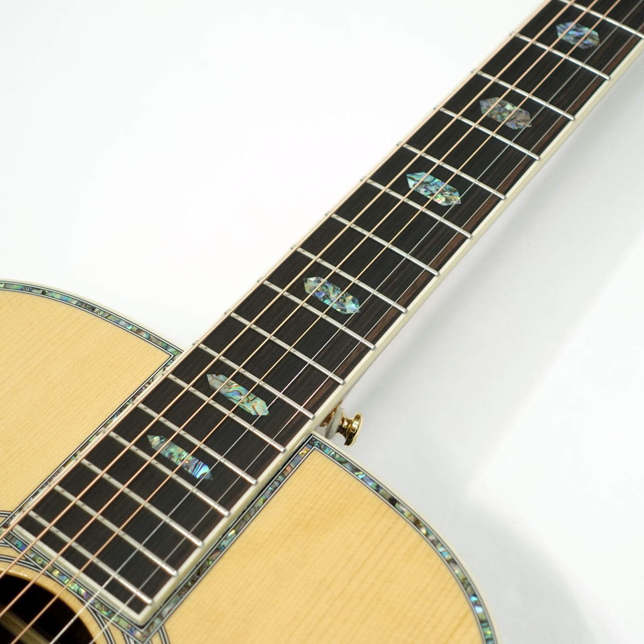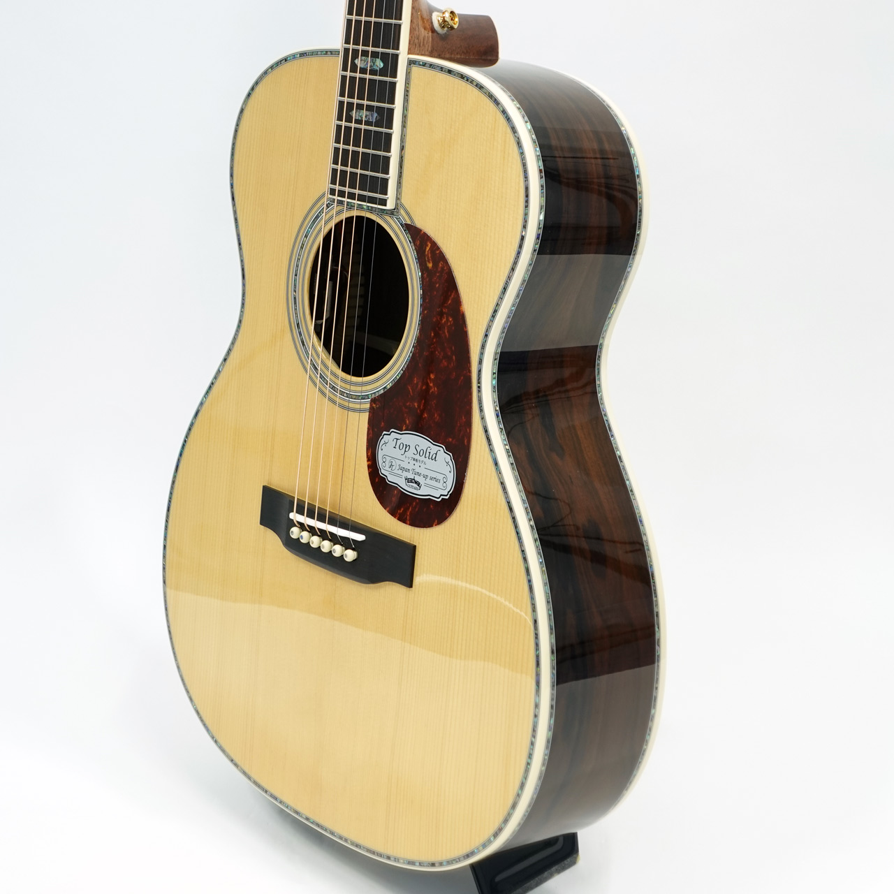 ボディサイドバック材には複雑な杢理が特徴的なジリコテを採用。アバロン貝の装飾と相まって高級感が漂う仕上がりです。