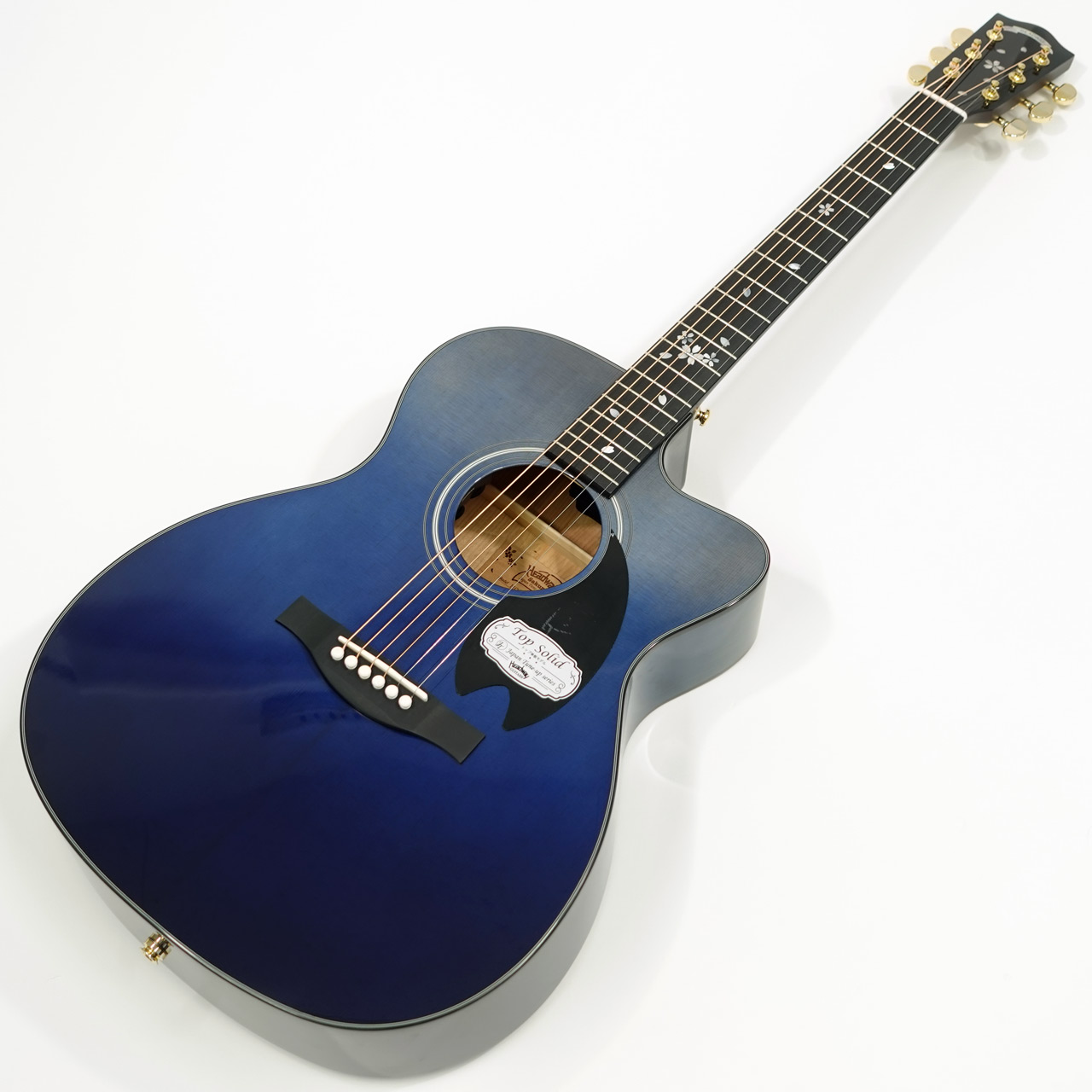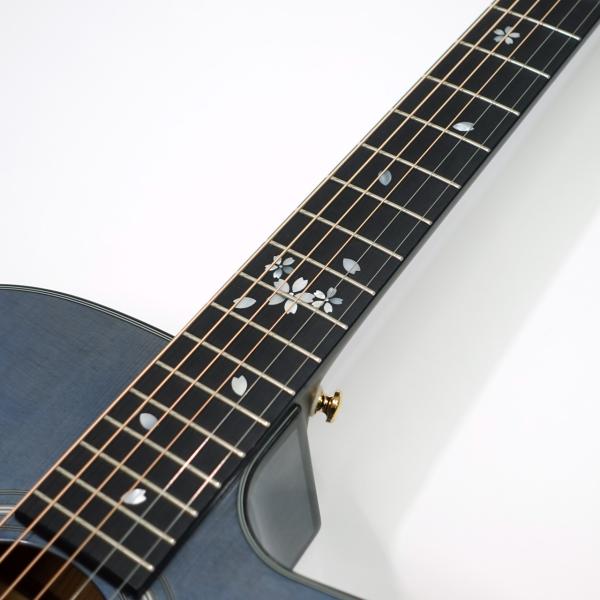 へッドトップと指板には桜ギターモデルの多くで採用してきた、桜をモチーフとした装飾を施しています。素材には光の反射角や見る角度によってその輝きが変化する天然の白蝶貝を用いており、桜ギターとしての個性を際立たせます。指板材には高い密度を持つミカルタを採用。エボニーにもよく似た黒々とした見た目と、優れた耐久性が特徴です。