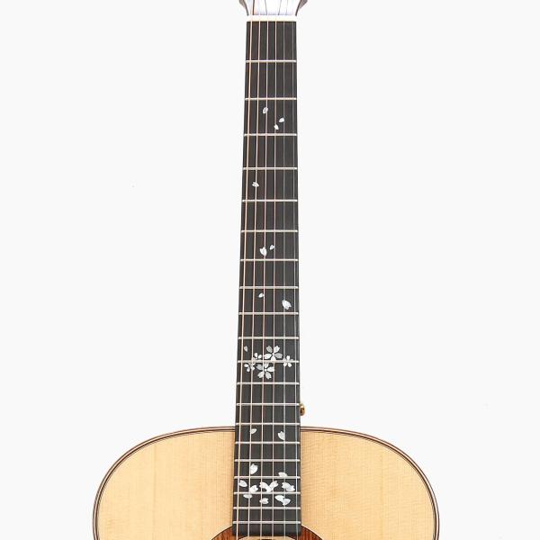 元となったギターと同様に、小ぶりなボディシェイプを採用し、サイドバックには国産の桜材、指板には縞杢が際立つエボニー材を選定。ボディにはあえてピックガードを取り付けず、装飾をシンプルに抑えることで鳴りを最大限に引き出しています。