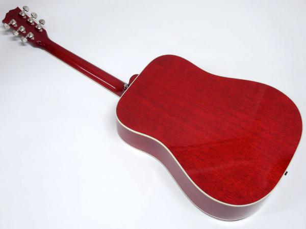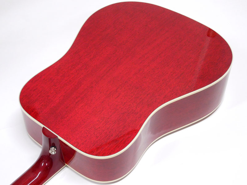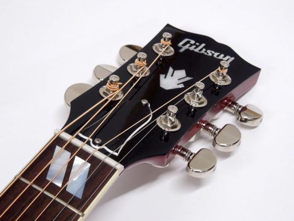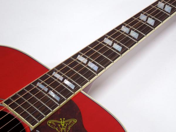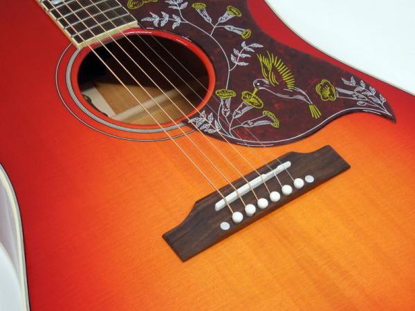 あまりジャキジャキせず、フィンガーでもストロークでもバランス良く鳴ってくれる優秀な機種。ヘッドにはクラウンを、また指板のインレイにはダブルパラレログラムインレイを採用。そしてなんといってもハミングバード特有のこの特徴的なピックガードがたまりません。サウンド、ルックスどれをとってもギブソンアコギでは一、二を争う人気機種です。