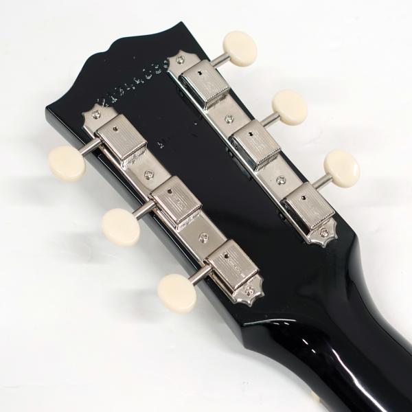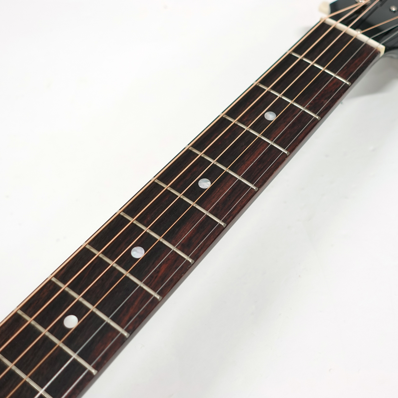 トップ材はシトカスプルースにサイド&バック材はマホガニー、マホガニー材ネック(ラウンドネック)、牛骨ナット&サドル、、Grover 3連ペグ(クリームボタン)チューナー、ボーンサドル&アッパーベリーブリッジ、少しアンティーク色がかった処理のバインディングやトーティスのラージピックガードで雰囲気抜群です。