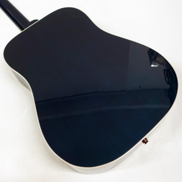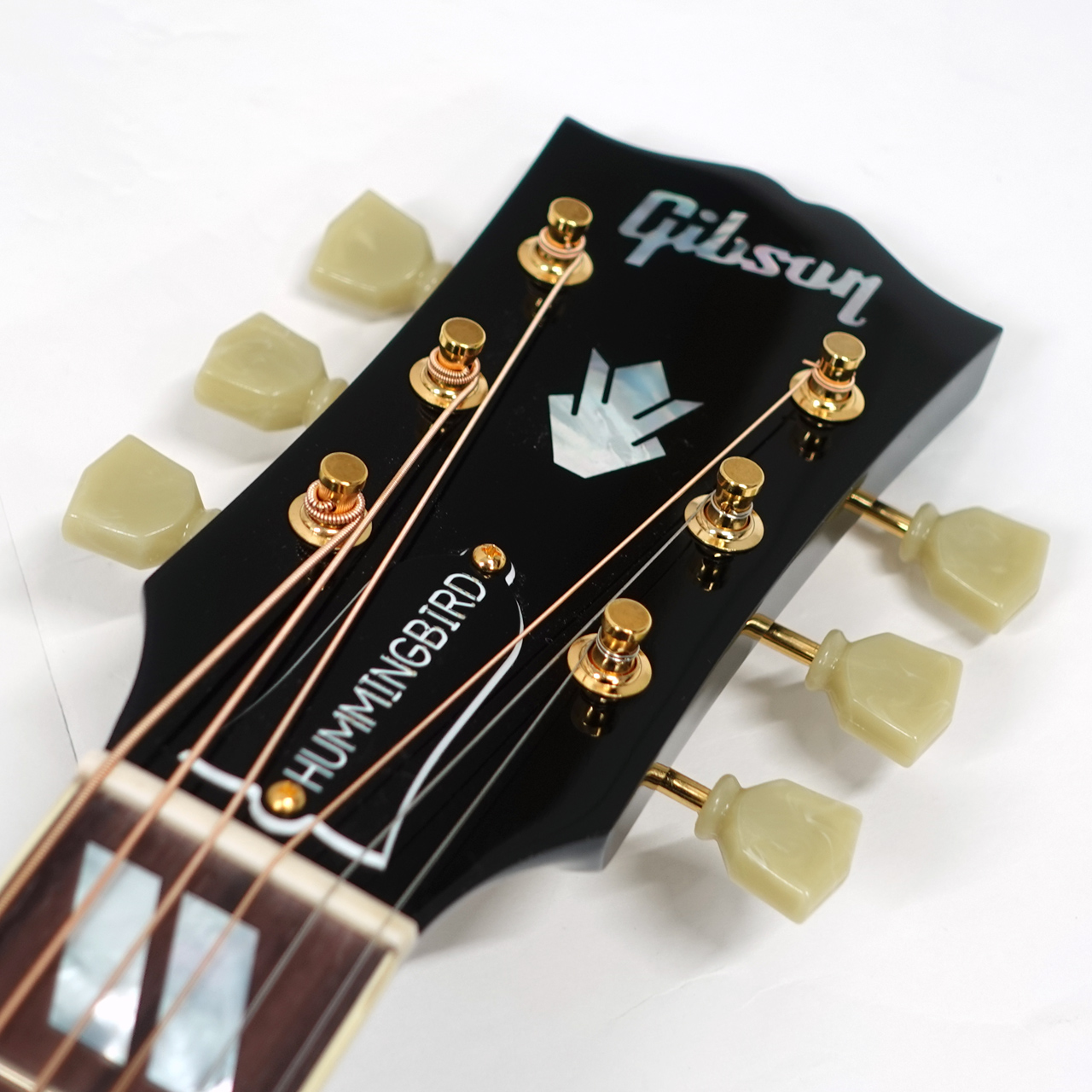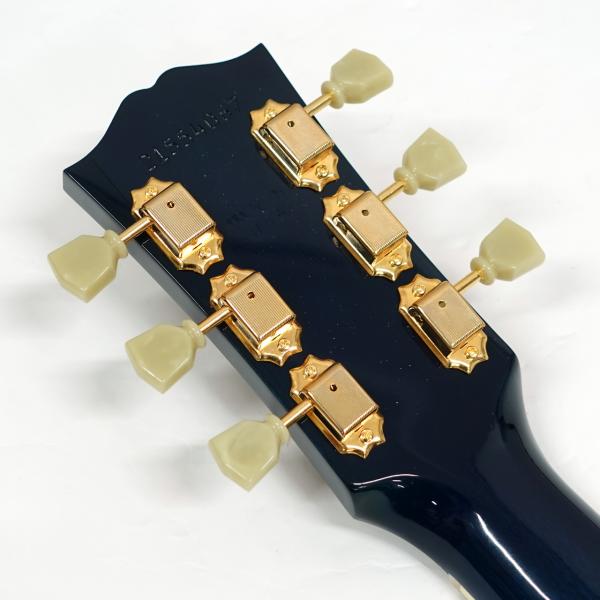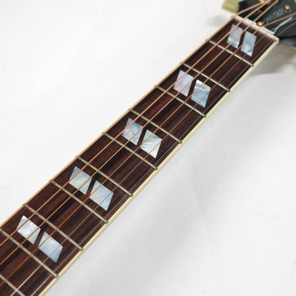 固定サドルですのであまりジャキジャキせず、フィンガーでもストロークでもバランス良く鳴ってくれます。ヘッドにはクラウンを、また指板のインレイにはダブルパラレログラムインレイを採用。そしてなんといってもハミングバード特有のこの特徴的なピックガードがたまりません。サウンド、ルックスどれをとってもギブソンアコギでは一、二を争う人気機種です。
