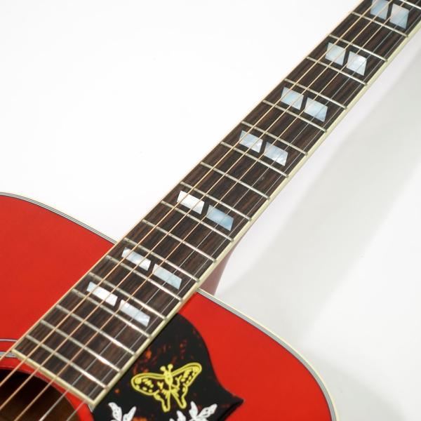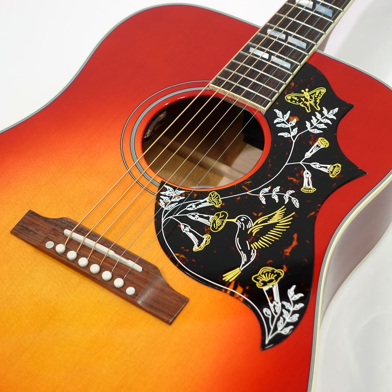 ヘッドにはクラウンを、また指板のインレイにはダブルパラレログラムインレイを採用。そしてなんといってもハミングバード特有のこの特徴的なピックガードがたまりません。サウンド、ルックスどれをとってもギブソンアコギでは一、二を争う人気機種です。