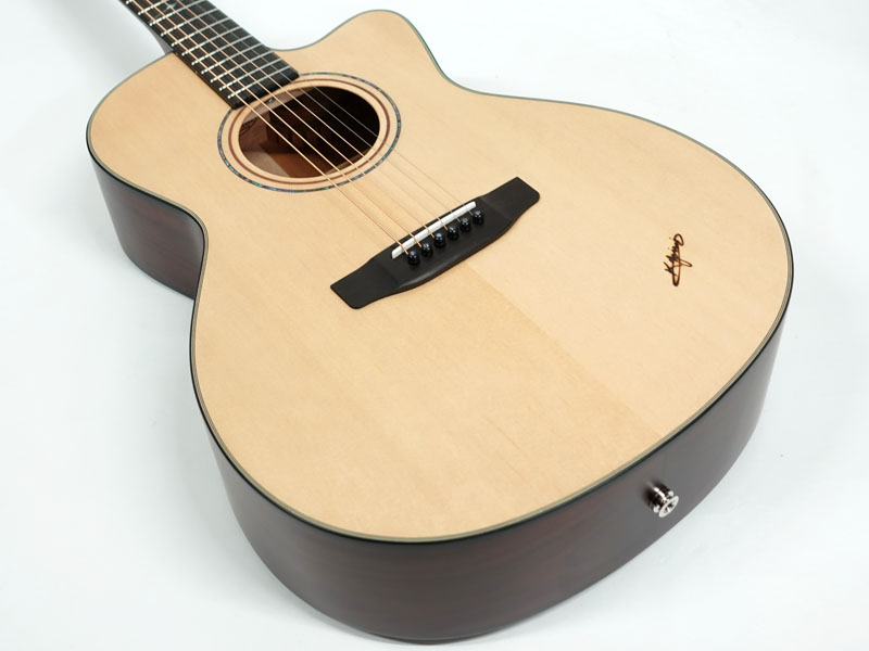 プライウッド仕様の硬質なボリビアンローズのサイドに対して、柔らかいスプルースとマホガニーのトップ&バックが良く響き、広がりのある豊かなボディ鳴りを体感して頂けます。
