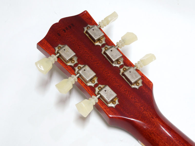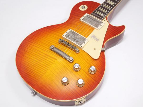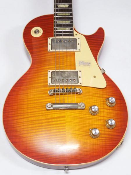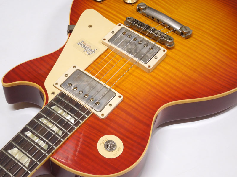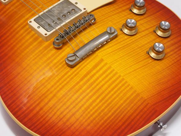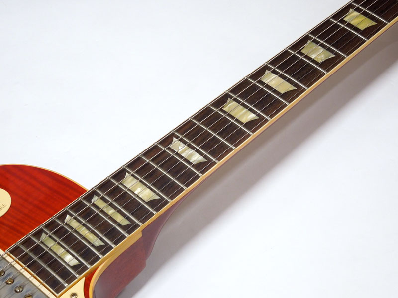 マホガニーボディに杢目の出たフィギャードメイプルトップ、マホガニーネックにインディアンローズウッド指板。いずれもカスタムショップならではの高いグレードのマテリアルがハイドグルーにて組み込みされています。