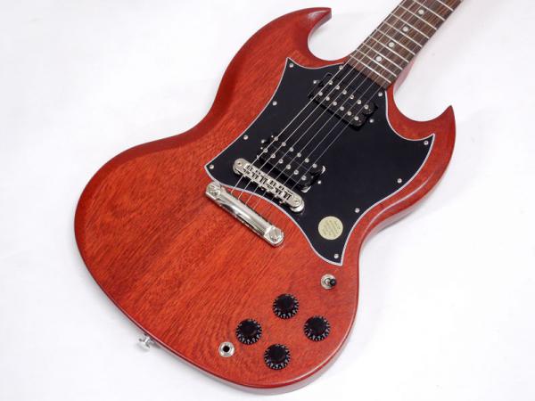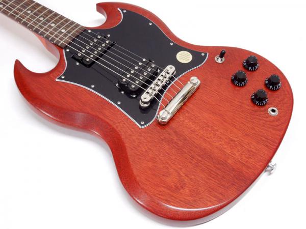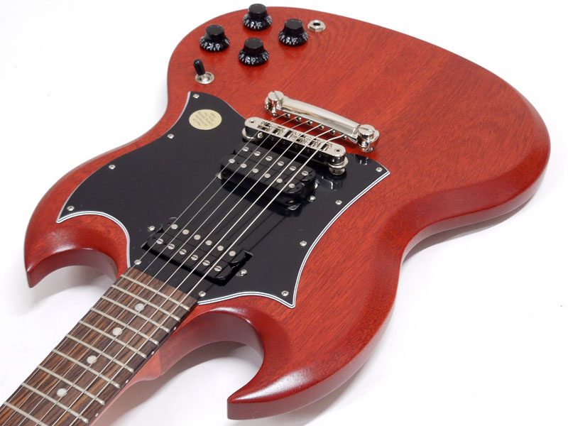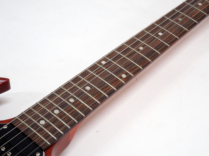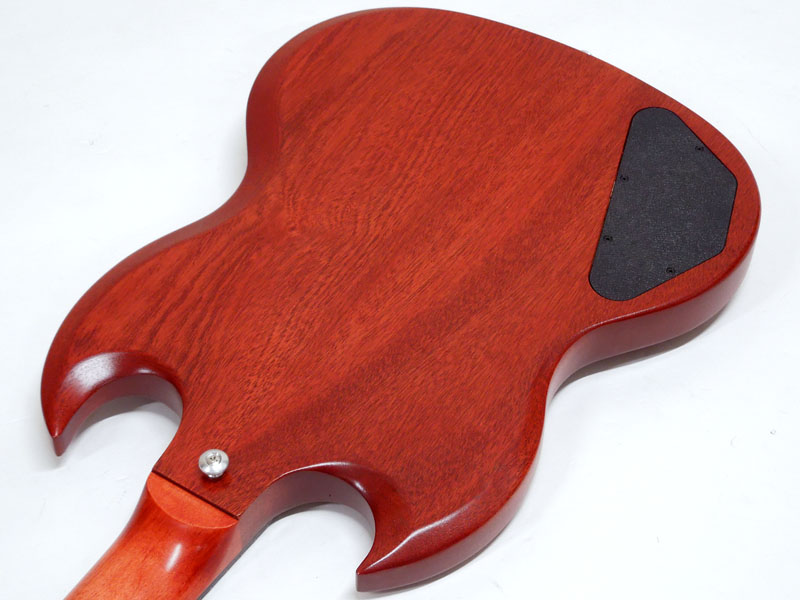 シンプルな艶消しマホガニーボディにメイプルネック、ローズウッド指板。メイプルネックはラウンドシェイプで安定したグリップ感があります。