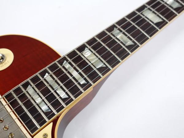カスタムショップグレードの深い杢目のフレイムメイプルトップに褪せた色味を再現したウォッシュドチェリーサンバーストにてフィニッシュしています。