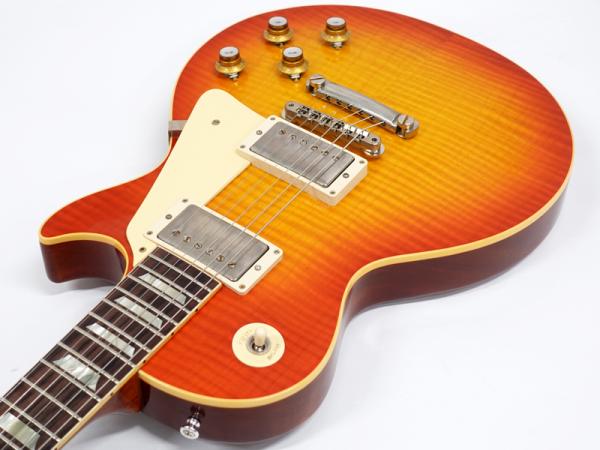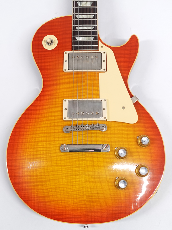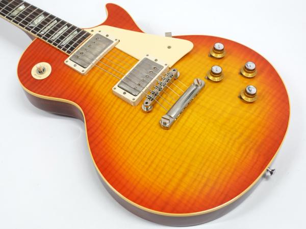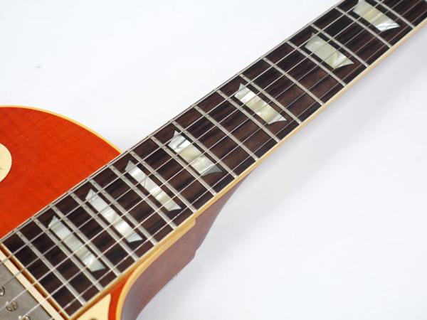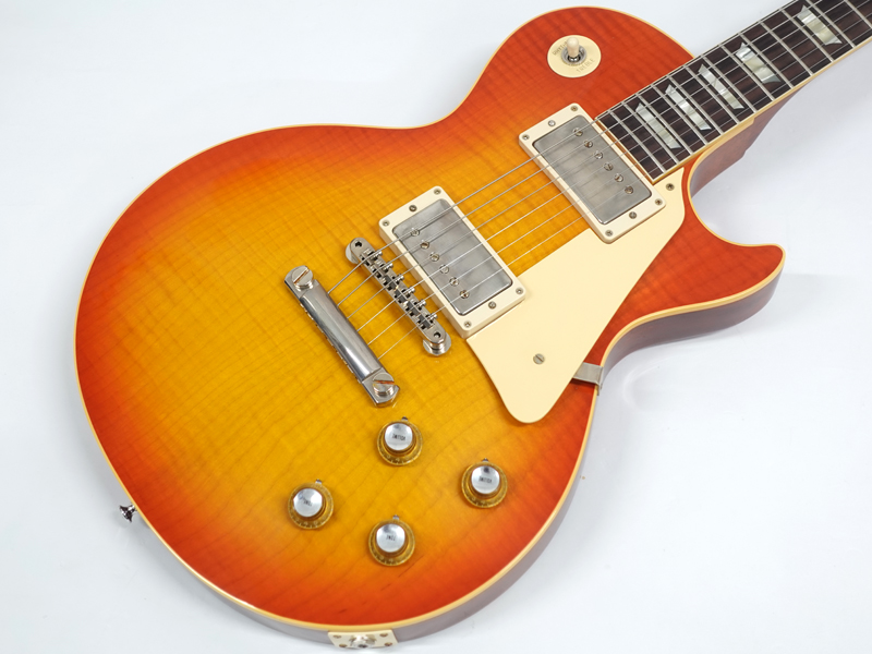 カスタムショップグレードの深い杢目のフレイムメイプルトップに褪せた色味を再現したオレンジレモンフェイドバーストにてフィニッシュしています。