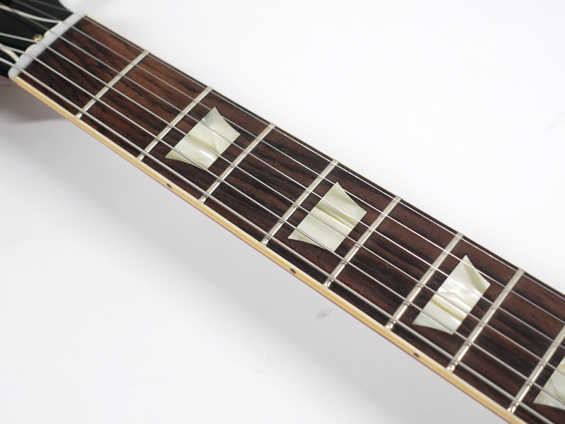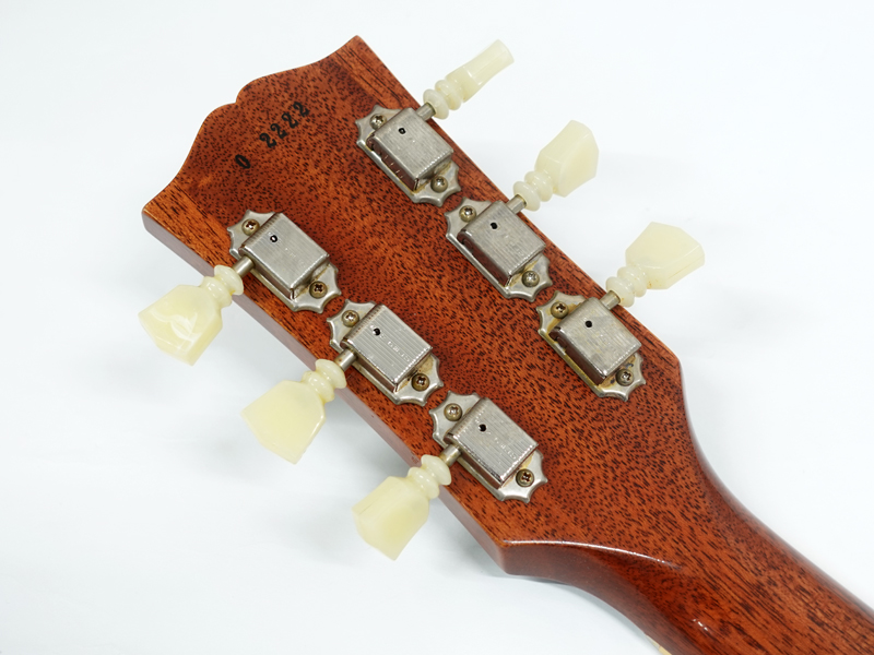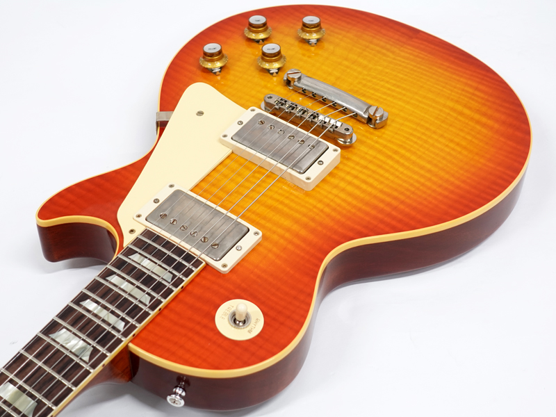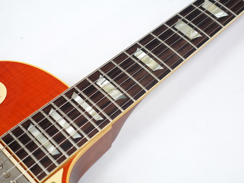 マホガニーボディにメイプルトップ、マホガニーネックにインディアンローズウッド指板。カスタムショップ製らしく伝統のハイドグルーにて接着されています。ネックは60年代仕様のスリムテーパーで弾きやすさ抜群です。