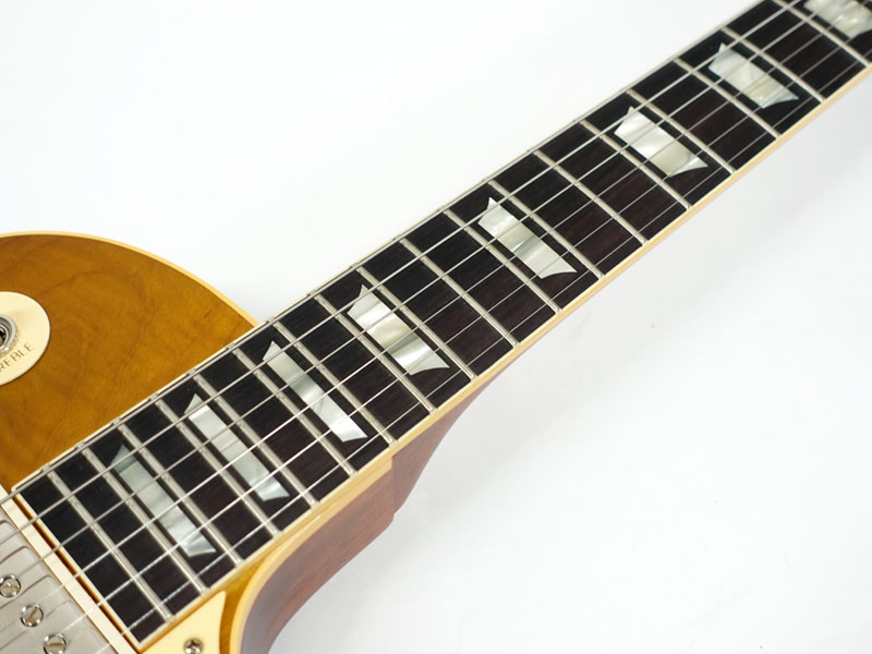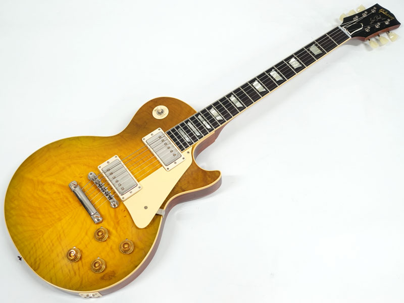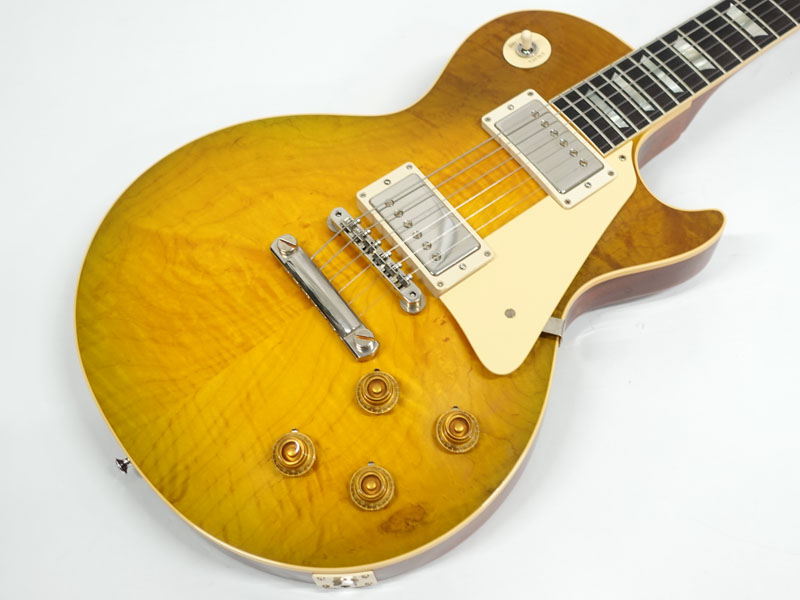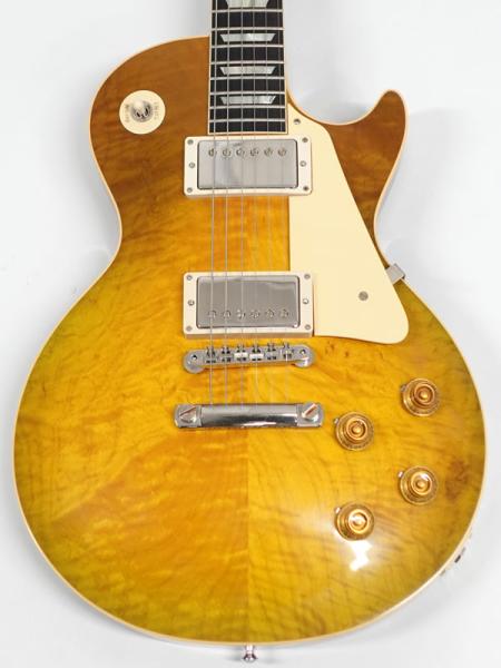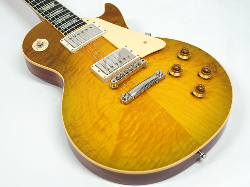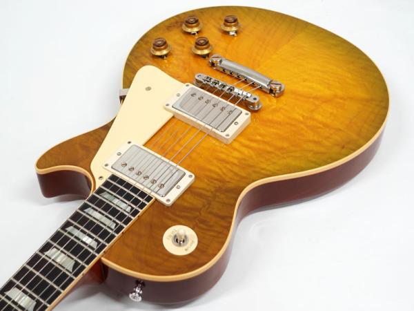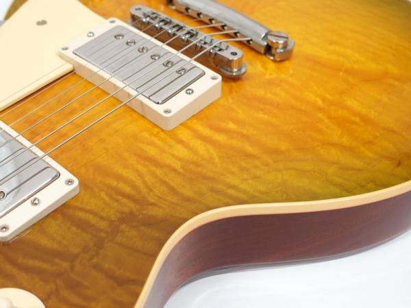 1Pマホガニーボディにフィギャードメイプルトップ、マホガニーネックにインディアンローズウッド指板。カスタムショップ製らしく伝統のハイドグルーにて接着されています。ディープジョイント、ネック角、ヘッド角、アーチ形状など高い再現を誇りサウンド、ルックス共に高い完成度です。レスポール60周年の大きなターニングポイントを経てオールニカワ接着、True Histoicパーツを採用し、サウンドとルックスは更にブラッシュアップ。高い完成度となっております。オリジナルトーンをさらに追及するためバンブルビーコンデンサーの見直し、ボリューム/トーンポットはより自然なカーブとなり、どのポイントでも使えるサウンドとなっております。