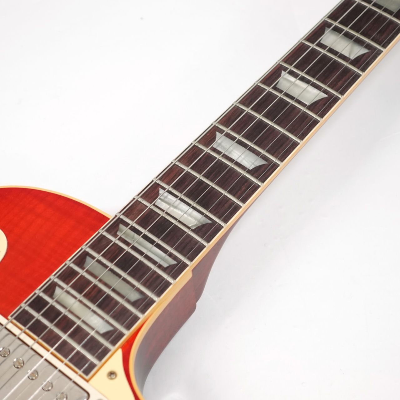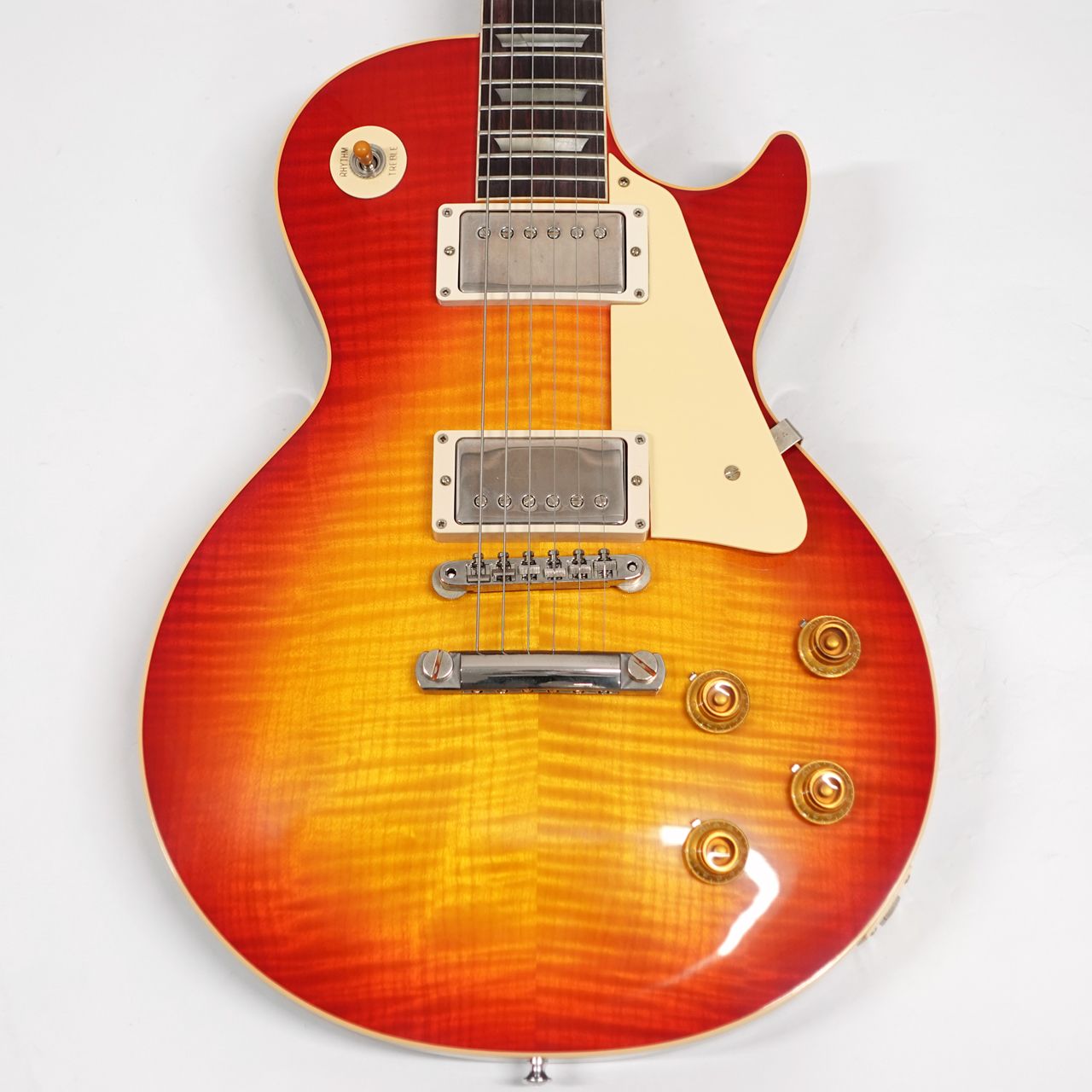 1Pマホガニーボディにフィギャードメイプルトップ、マホガニーネックにインディアンローズウッド指板。カスタムショップ製らしく伝統のハイドグルーにて接着されています。ディープジョイント、ネック角、ヘッド角、アーチ形状など高い再現を誇りサウンド、ルックス共に高い完成度です。レスポール60周年の大きなターニングポイントを経てオールニカワ接着、True Histoicパーツを採用し、サウンドとルックスは更にブラッシュアップ。高い完成度となっております。オリジナルトーンをさらに追及するためバンブルビーコンデンサーの見直し、ボリューム/トーンポットはより自然なカーブとなり、どのポイントでも使えるサウンドとなっております。