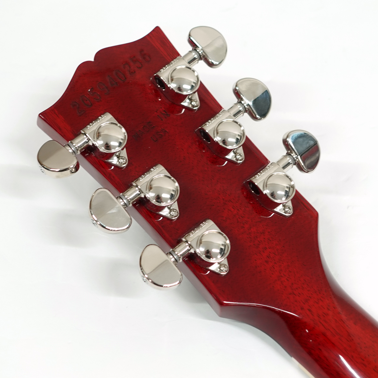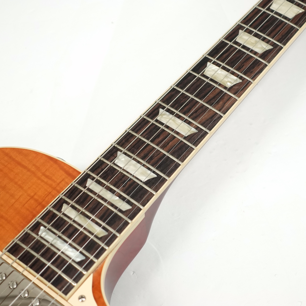 ノンウエイトリリーフの完全ソリッドボディのマホガニーボディにメイプルトップ、マホガニーネックにローズウッド指板。ネックは自然なグリップ感のスリムテーパーネック。