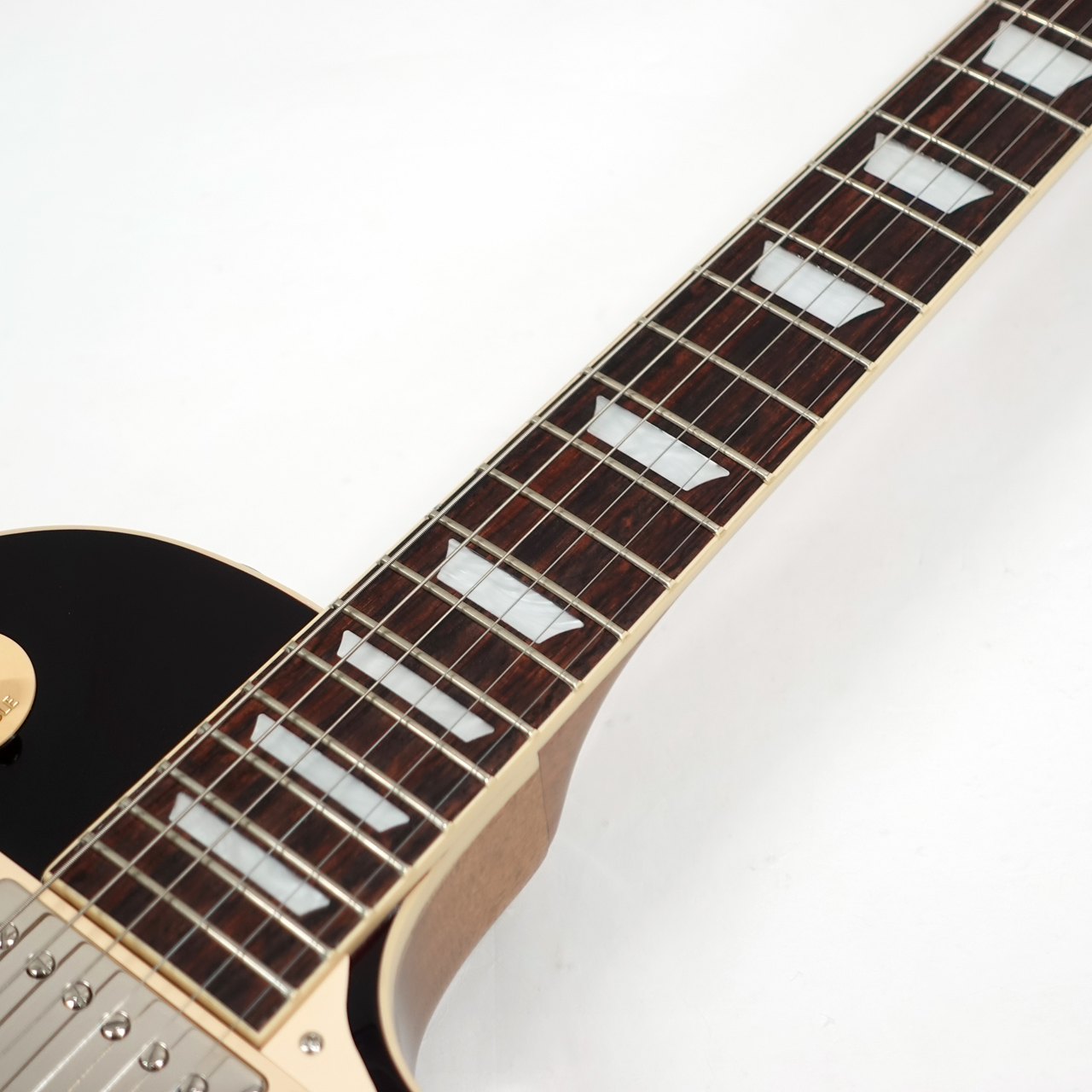 ノンウエイトリリーフの完全ソリッドボディのマホガニーボディにメイプルトップ、マホガニーネックにローズウッド指板。ネックは自然なグリップ感のスリムテーパーネック。