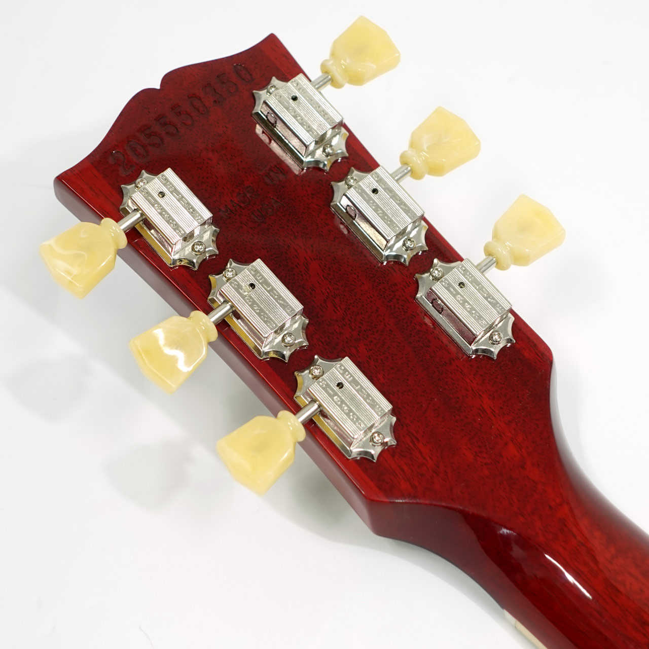 ノンウエイトリリーフの完全ソリッドボディのマホガニーボディにメイプルトップ、マホガニーネックにローズウッド指板。Vintage 50sの丸みのあるグリップは握り込んで演奏するのに程よい太さです。