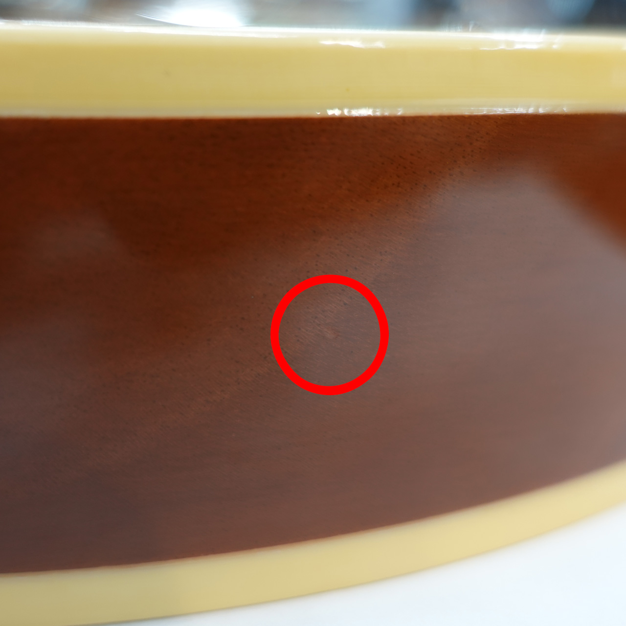 ボディバックのマホガニー材はウエイトリリーフと呼ばれる軽量化の加工が施されており、ストレスのない演奏性です。