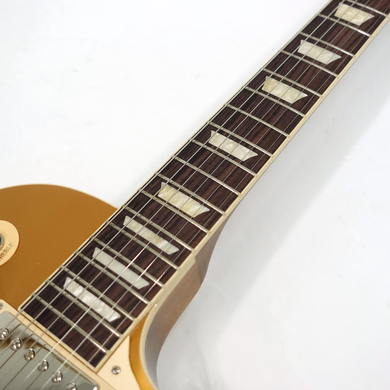ノンウエイトリリーフの完全ソリッドボディのマホガニーボディにメイプルトップ、マホガニーネックにローズウッド指板。Vintage 50sの丸みのあるグリップは握り込んで演奏するのに程よい太さです。