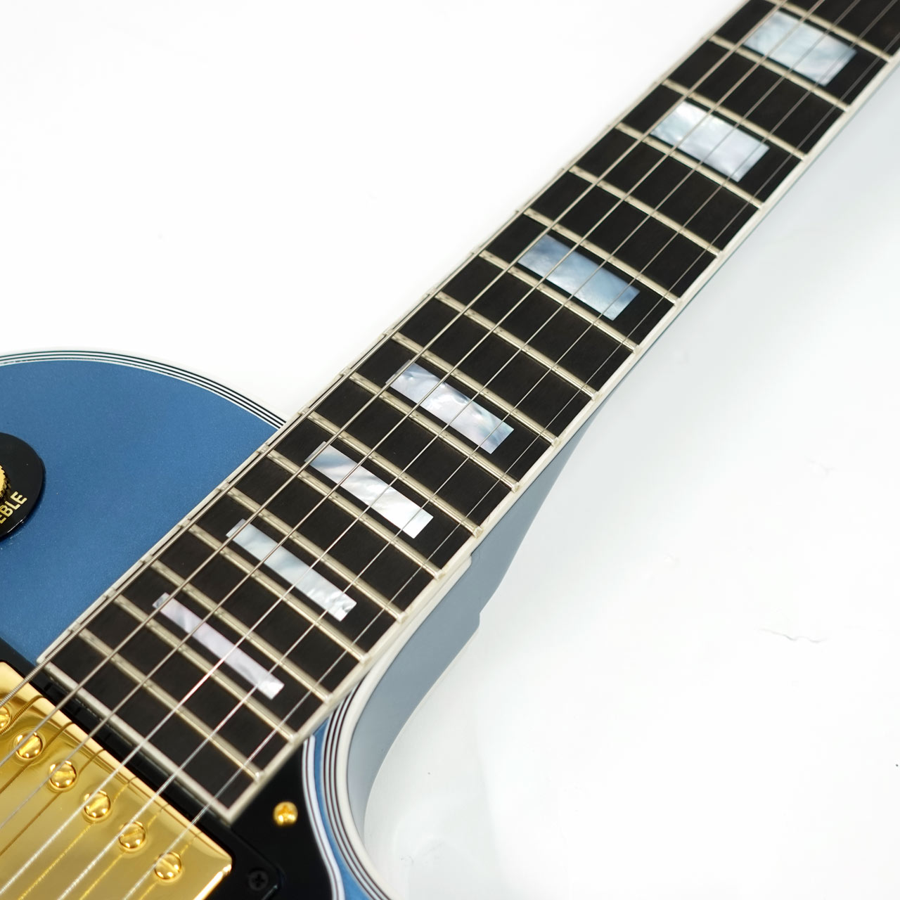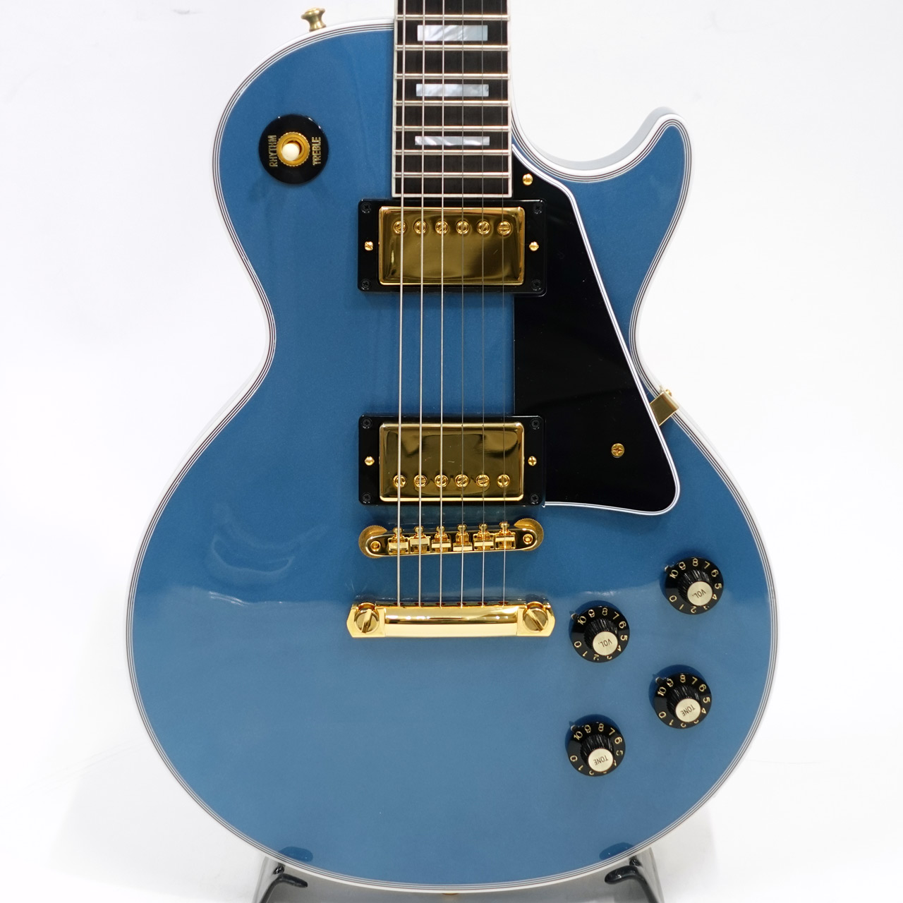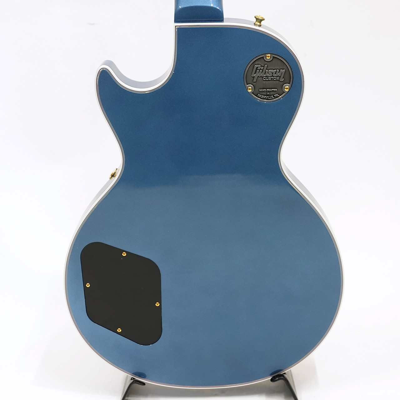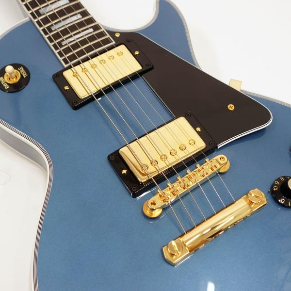 カタログに無いペルハムブルーフィニッシュを採用し、カスタム特有のインレイやゴールドハードウェアと合わせて高級感のあるルックス。