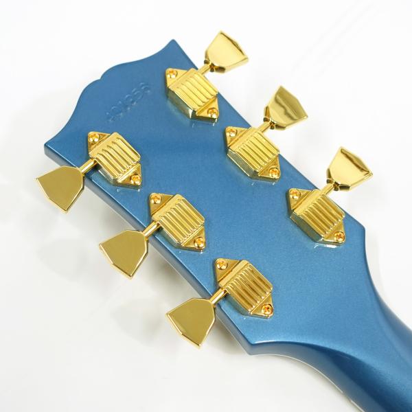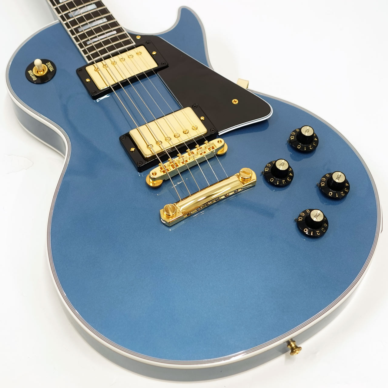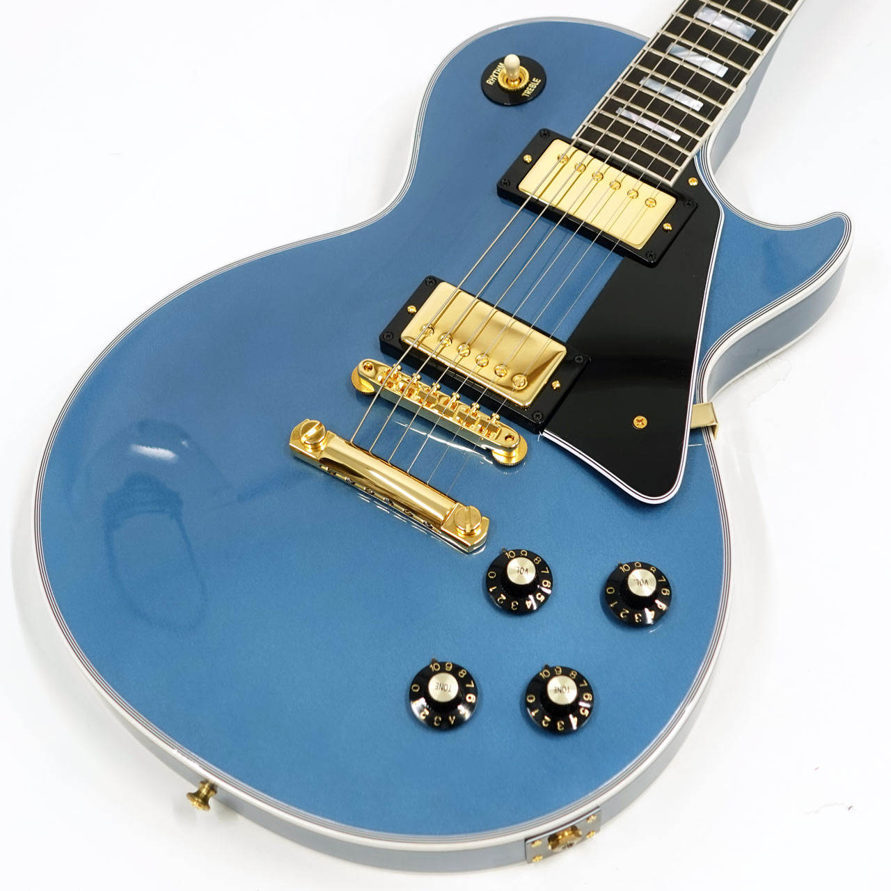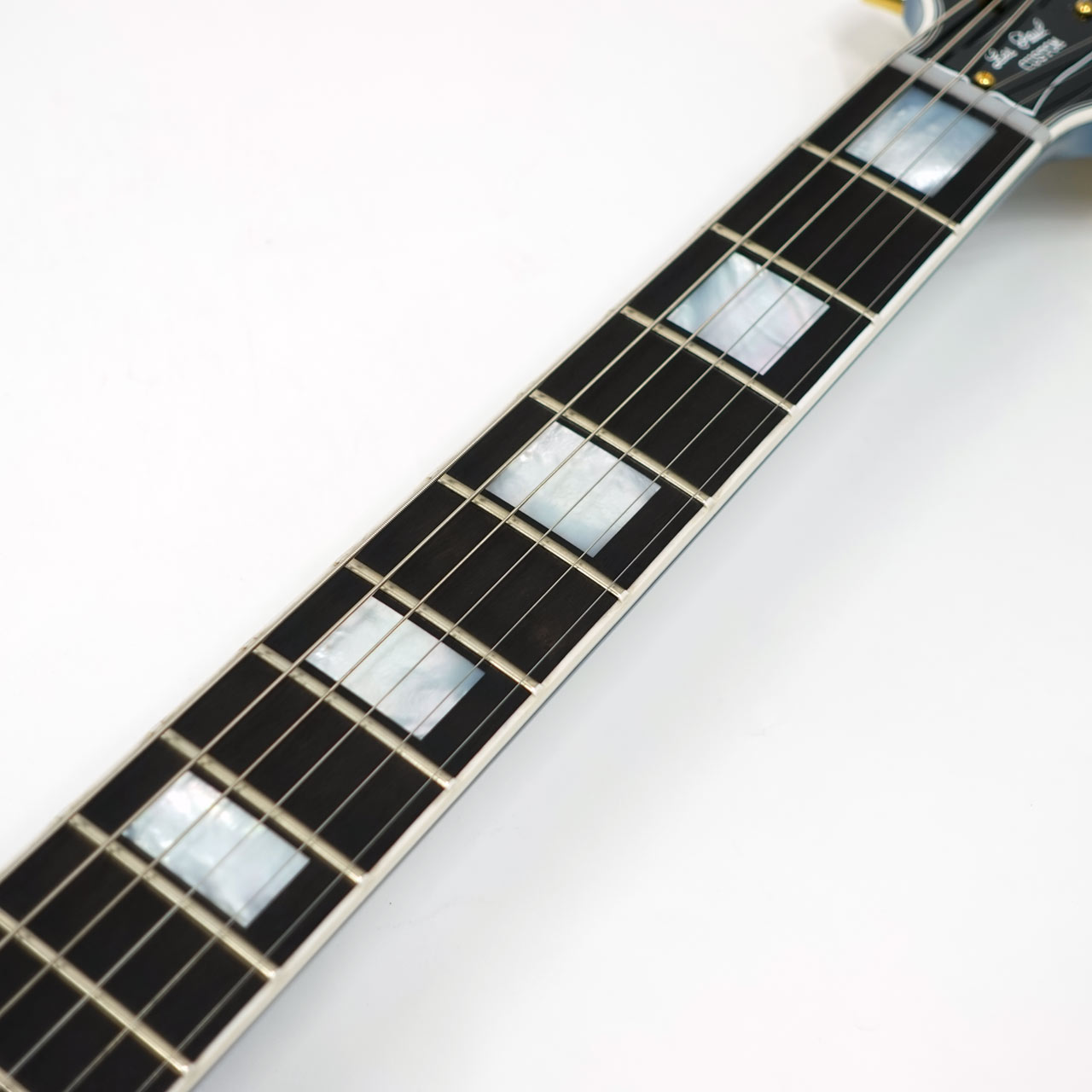 カタログに無いペルハムブルーフィニッシュを採用し、カスタム特有のインレイやゴールドハードウェアと合わせて高級感のあるルックス。