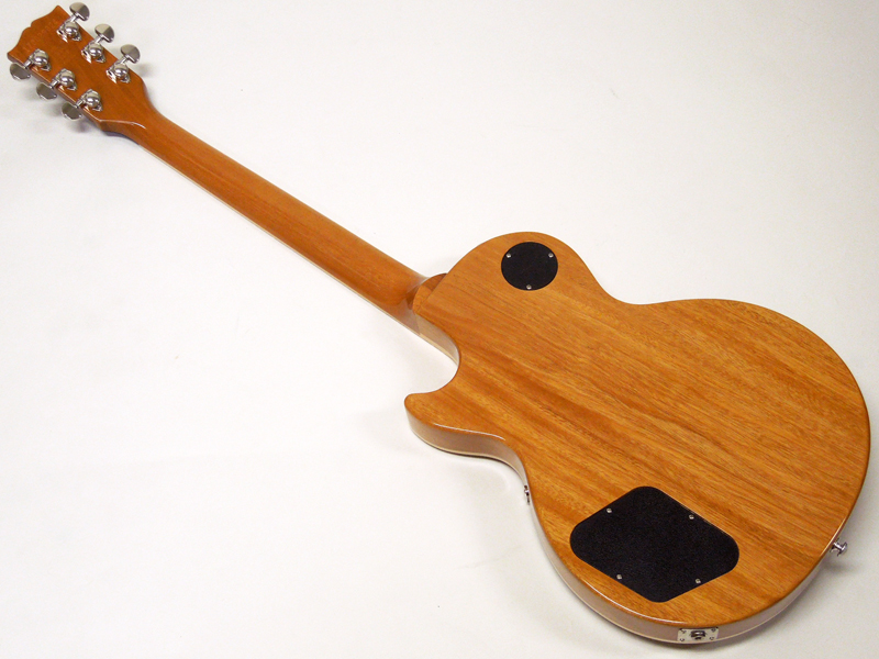 フレイムの出ていないプレーンなメイプルTopを使用、派手すぎないシンプルなルックスです。マホガニーボディにはウエイトリリーフを採用、レスポールに懸念される重量を軽量化、取り回しがよく演奏性は抜群に良いです。