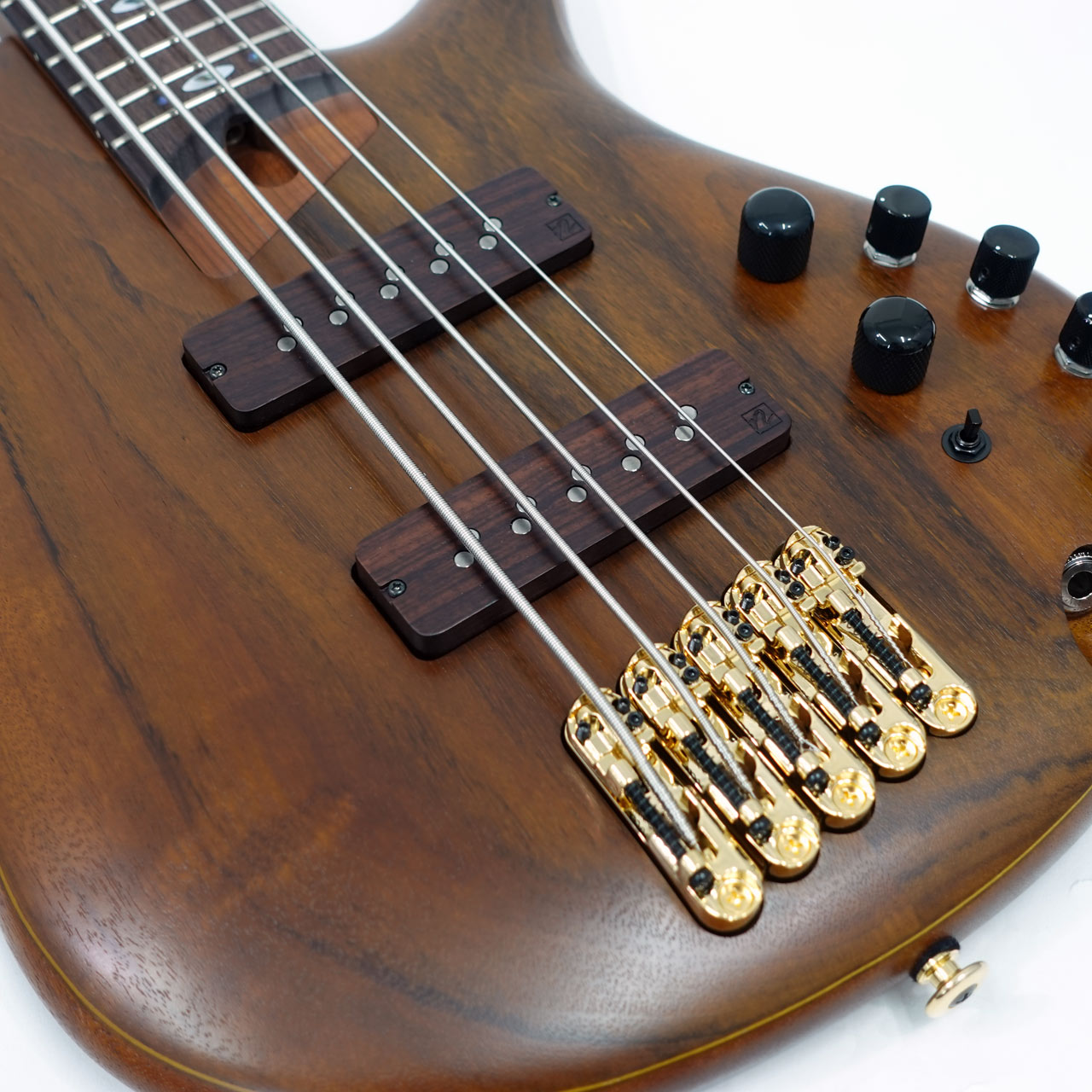 アフリカン・マホガニー材ボディ・バックに、オヴァンコール材トップを組み合わせた3次元アーチドSRボディ。ベース・サウンドに欠かせない豊かな中低音域特性とウォームなトーンに加え、アタック感と歯切れの良い高音域特性を求めたボディのマテリアル・チョイスです。また、木材本来の質感を色濃く感じられる艶消し仕上げを採用しました。