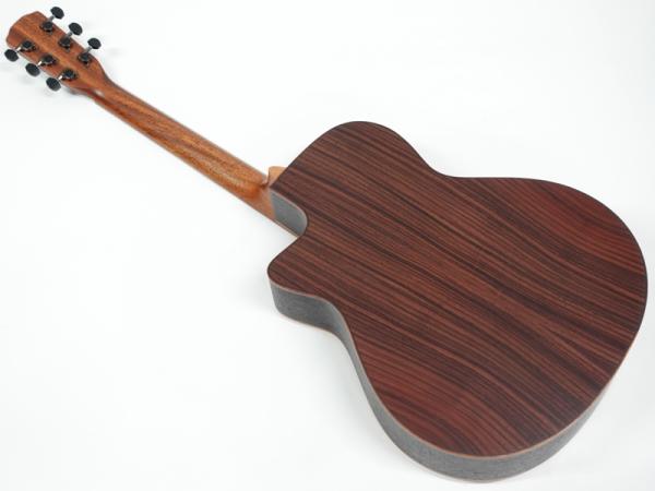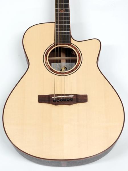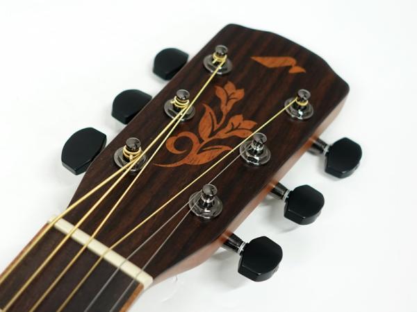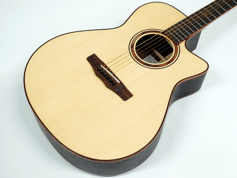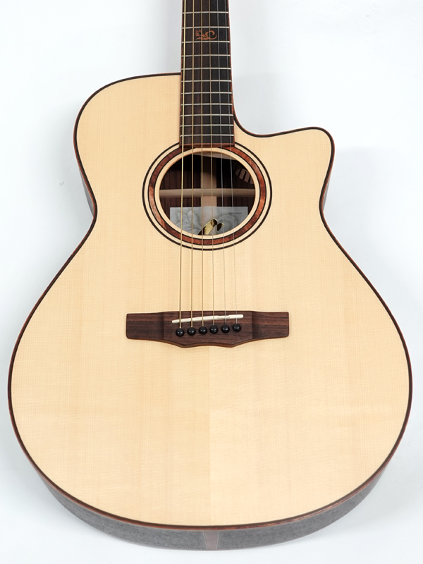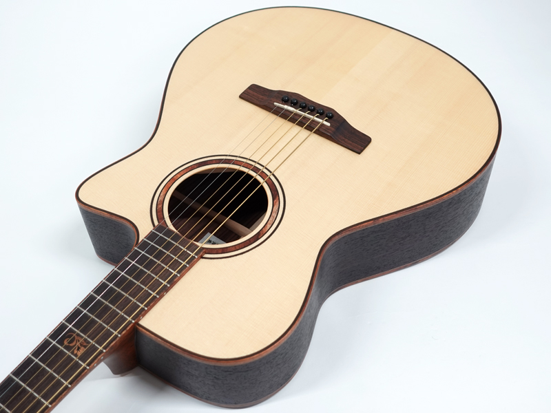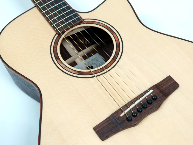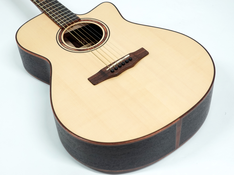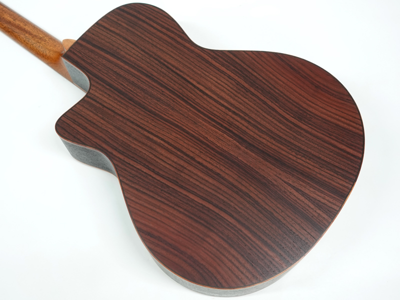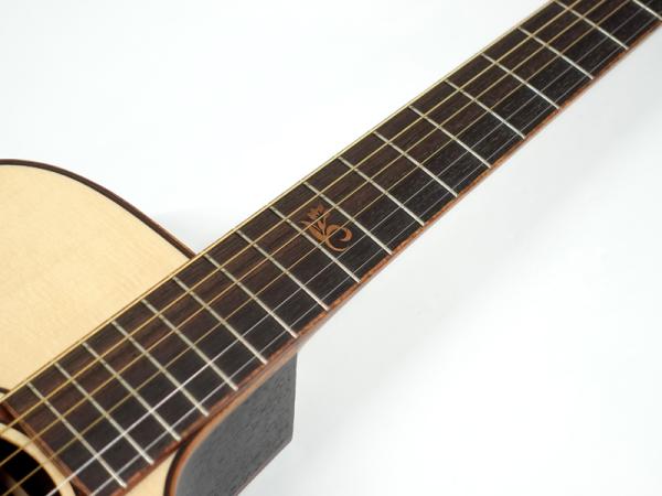 インゲルマン・スプルース単板トップ、インディアンローズウッド単板サイド&バック、インディアンローズウッド指板&ブリッジ。