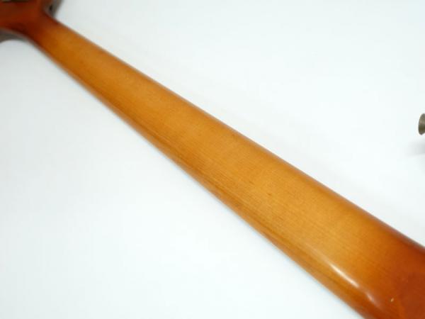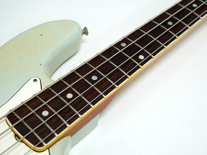 本機はアルダーボディ、ローズ指板という現代まで続く王道スペックを持ち、過渡期の1966年前期のパドルペグとバインディング&ドットポジションマークを組み合わせたルックスが特徴的なジャズベース。