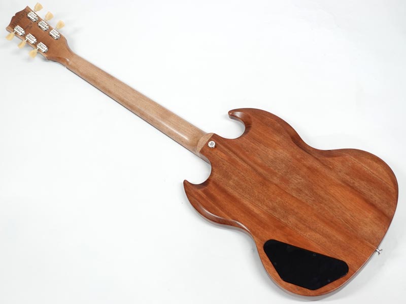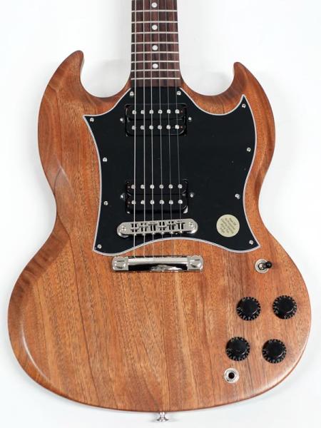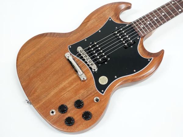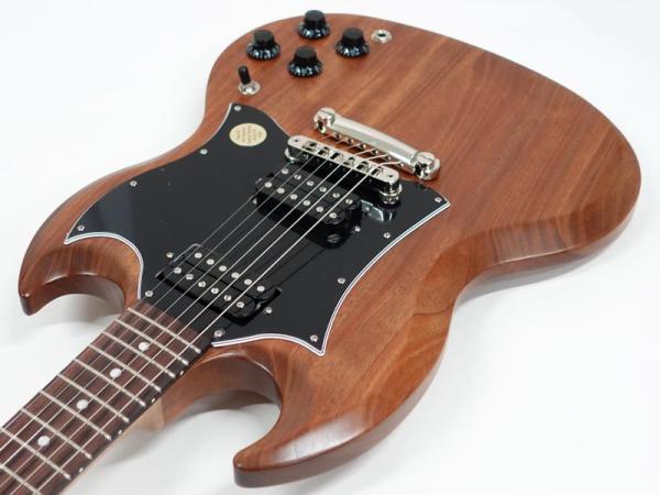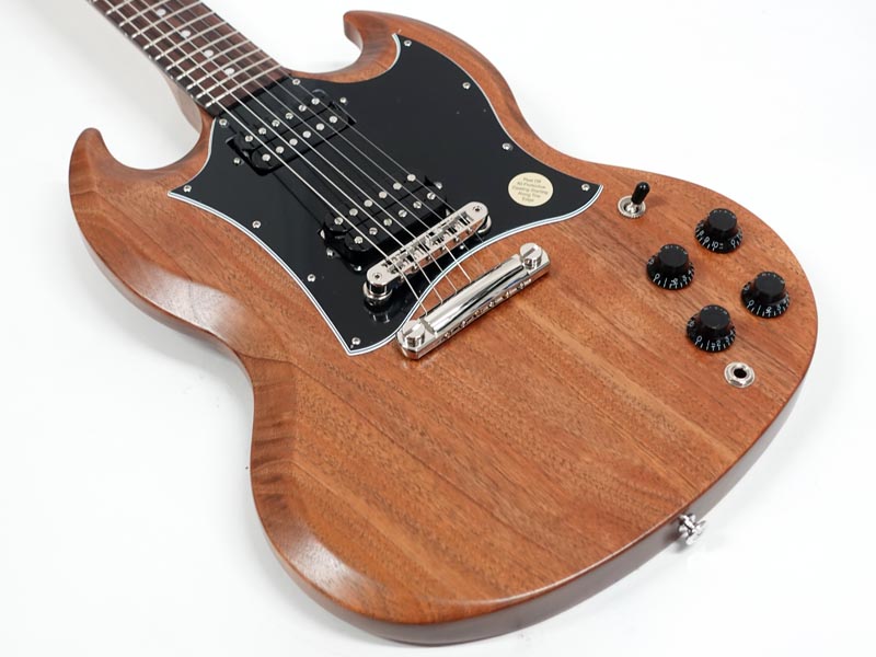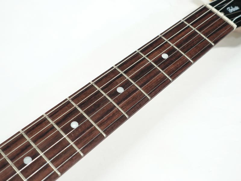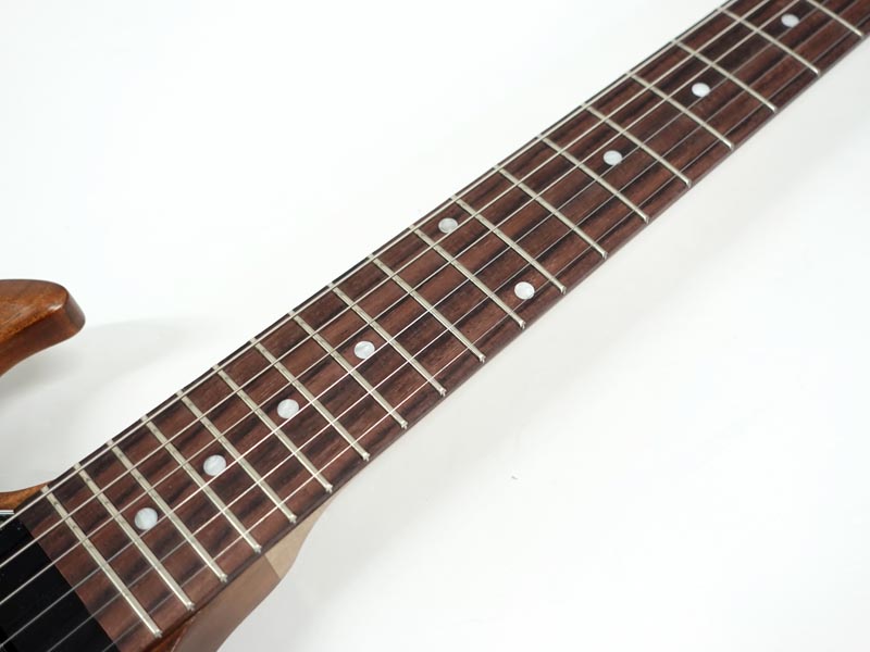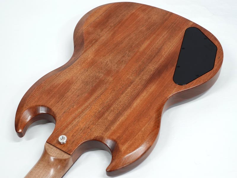 シンプルな艶消しマホガニーボディにメイプルネック、ローズウッド指板。メイプルネックはラウンドシェイプで安定したグリップ感があります。