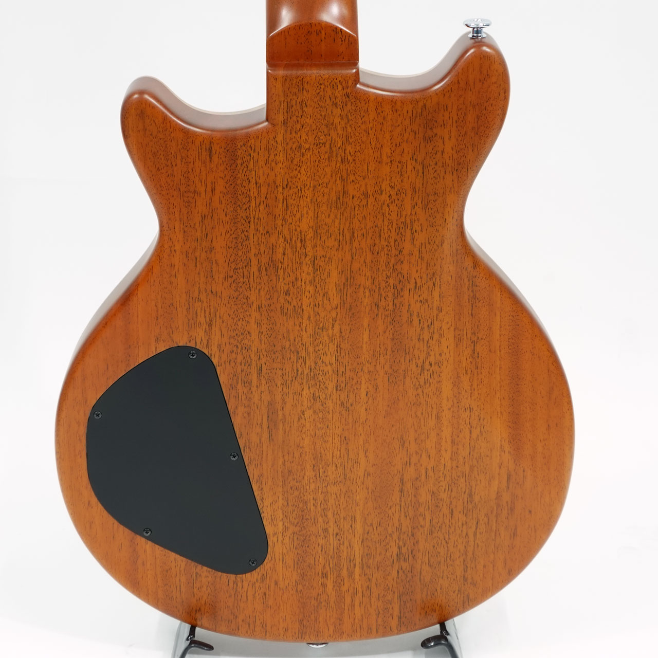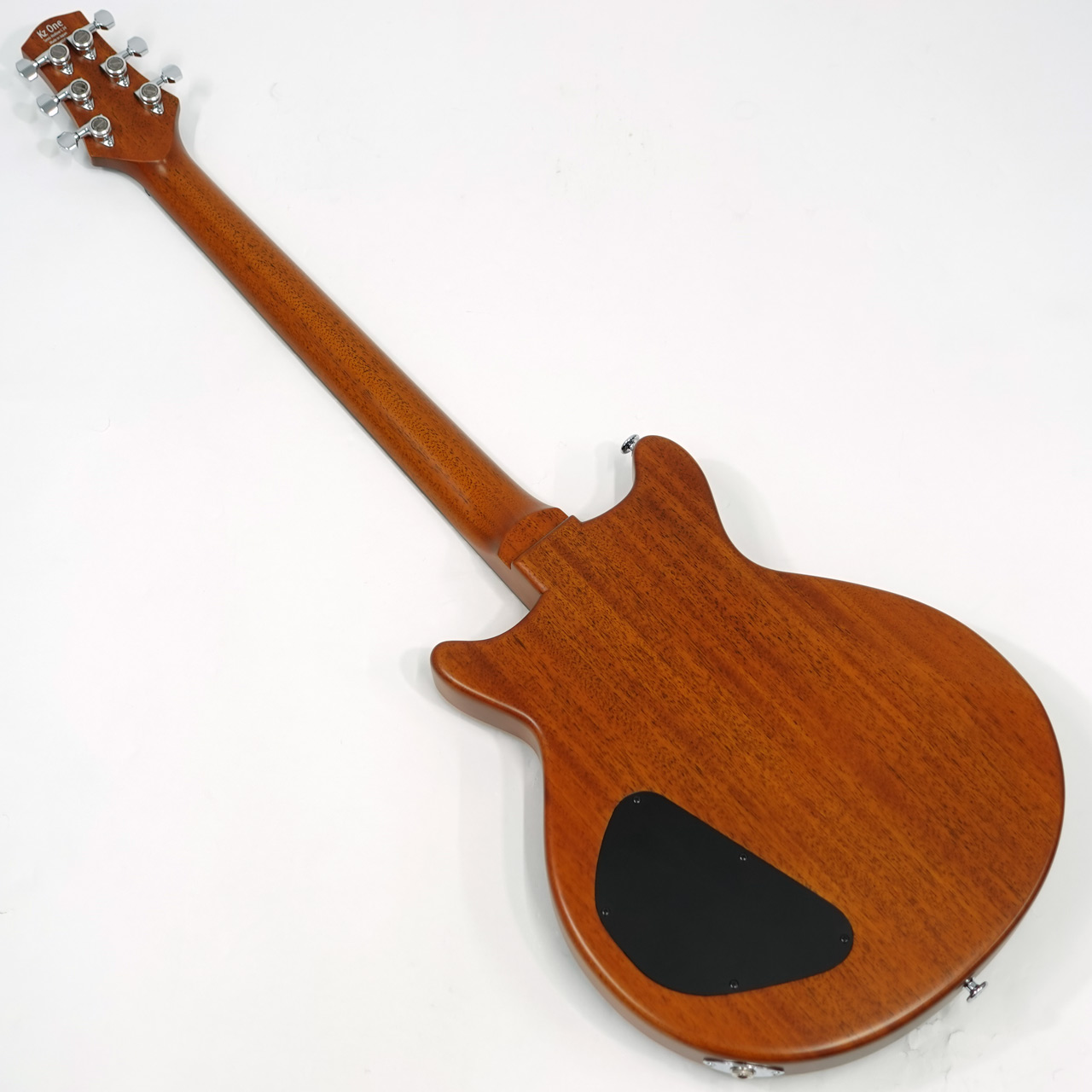 セミホロウ仕様の本機はボディ材にマホガニーを採用。トップ材には美しい杢目の4Aグレードキルトメイプルを採用。