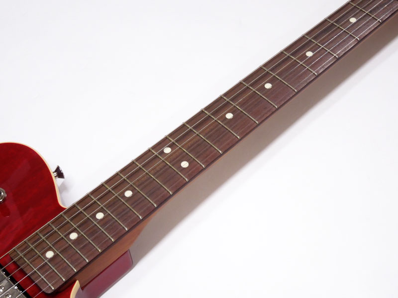 ネックはサテン仕上げ、ローズウッド指板にナロートールフレット、鍔出しの22フレット仕様です。