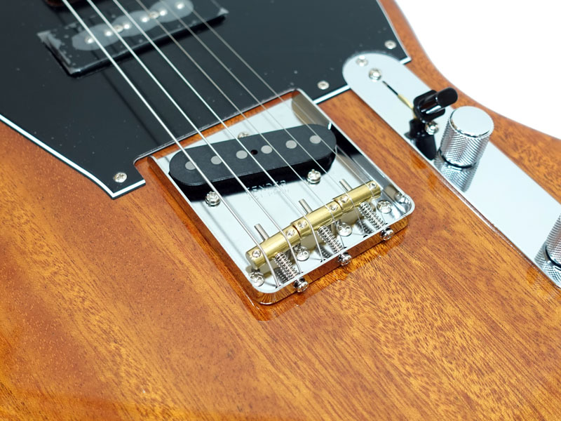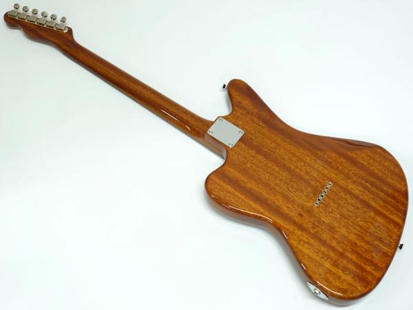 マホガニーのジャズマスターボディにマホガニーのテレキャスターネック。ブラスサドルのテレキャスブリッジとピックアップ、フロントにはソープバータイプのピックアップを搭載。