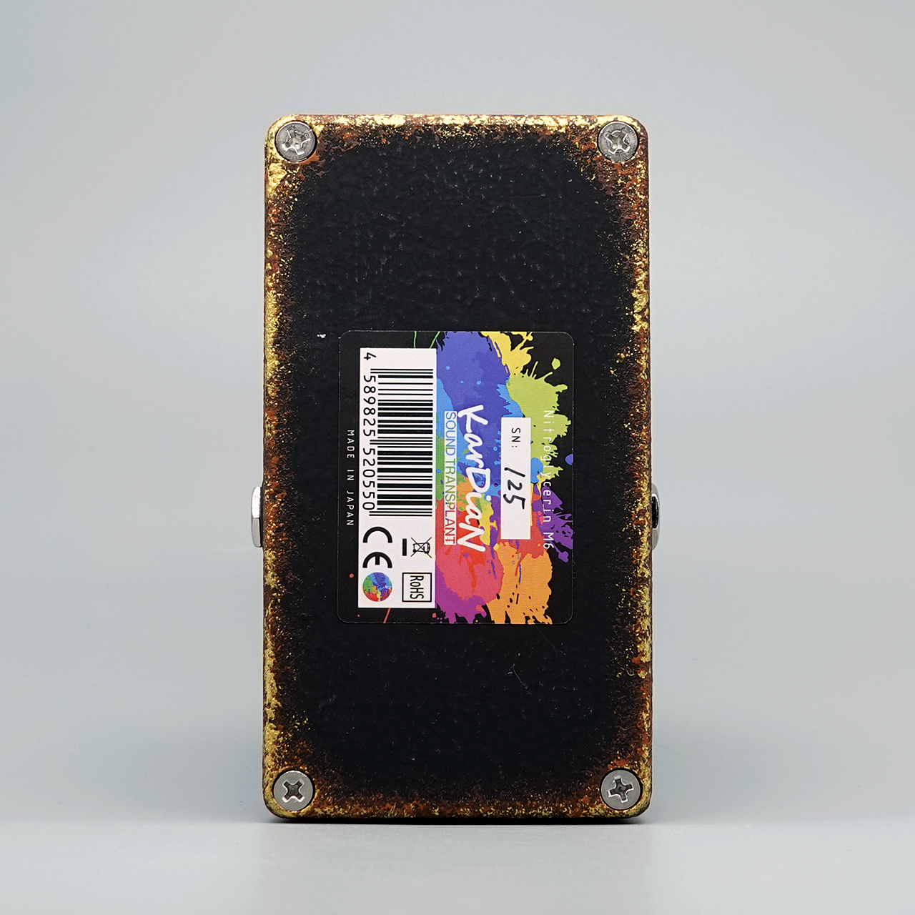 "Nitroglycerin M6" はパーツから特別なこだわりを持っています。特に実機にも使用されていたAjax Blue Moldedを忠実に再現した "SoZo NexGen Blue Molded" を300台分確保できたことが、このペダルを作るきっかけになったと言っても過言ではありません。オペアンプにもAnalog Devices OP275を採用しています、JFETベースのアンプがチューブの質感に近いサウンド効果をもたらします。