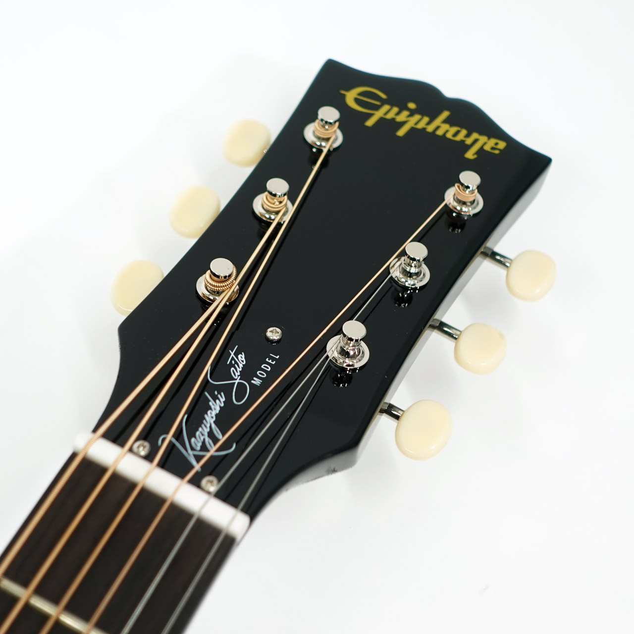 彼の2作目となるエピフォン・シグネチャーモデル「Inspired by Gibson Custom Kazuyoshi Saito J-45」は、単板マホガニーのバック&サイドに、熱処理によるエイジング加工を施したソリッド・シトカスプルースのトップを組み合わせた仕様です。ワンピース仕様のジェニュインマホガニー・ネックは、本モデル用に開発されたアーティスト・プロファイルを採用。ローズウッド指板にはマザー・オブ・パールのドットインレイが施され、20本のジャンボフレットを備えています。ギブソン・オープンブック・ヘッドストックには、ボーン・ナット、3連のクリームボタン付きのクローズドバック・チューナー、斉藤和義氏のサインを再現したトラスロッドカバーが装備されています。