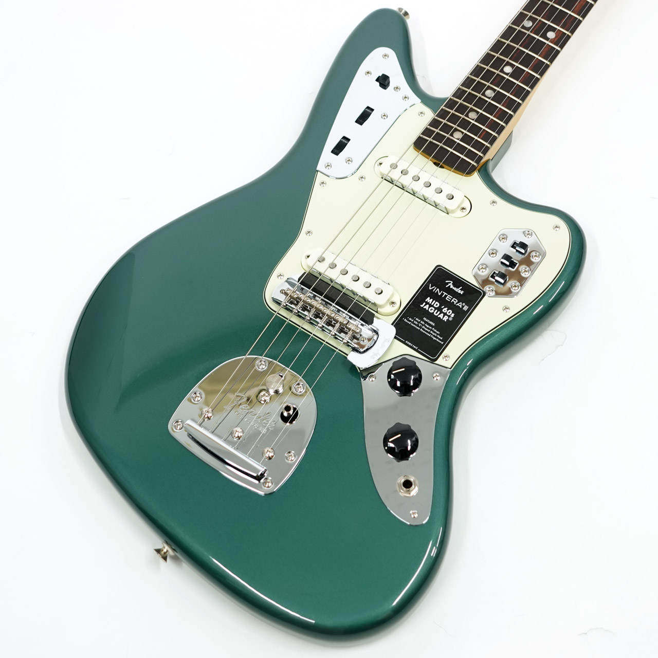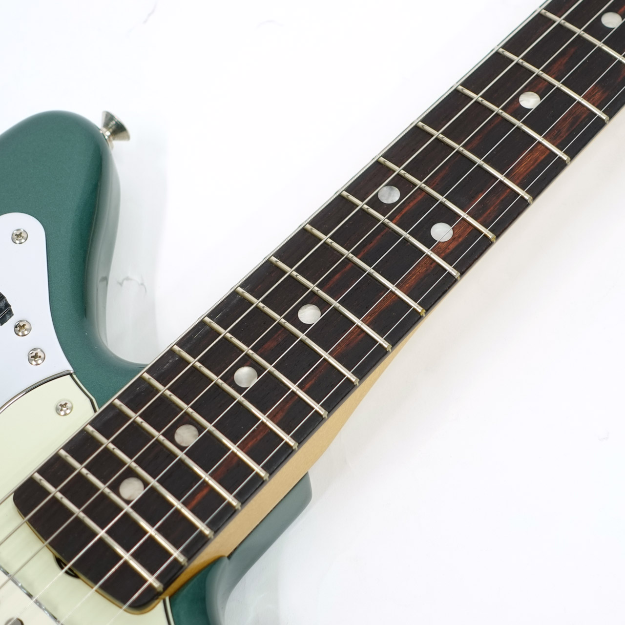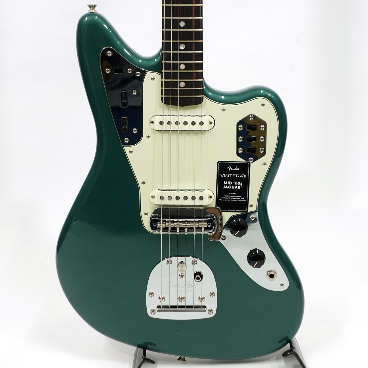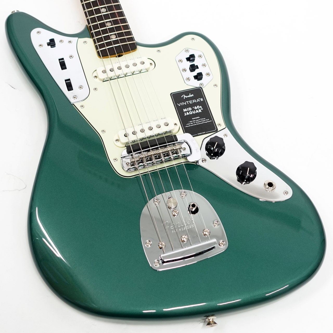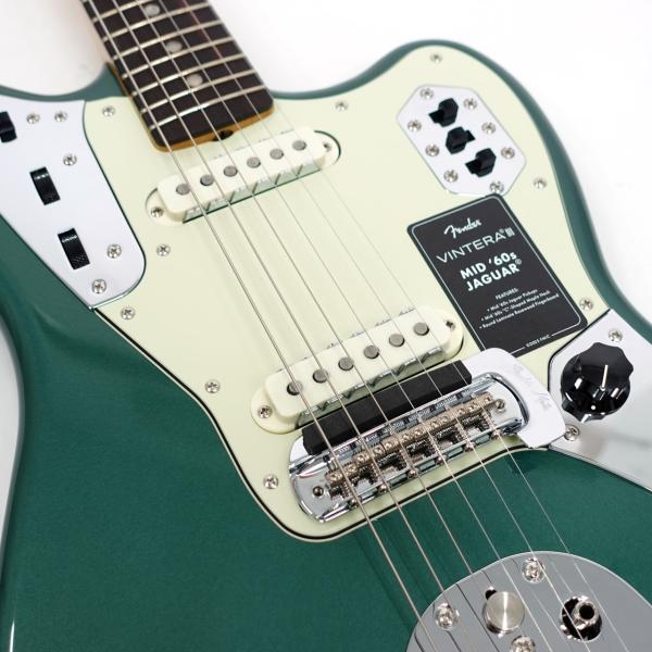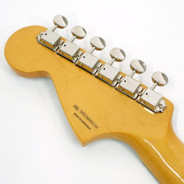 その他、ヴィンテージスタイルのトレモロロック付きフローティングトレモロ、音作りの幅を広げる当時仕様のリズムサーキット、ヴィンテージスタイルのJaguarミュートといった特徴を備えています。ヴィンテージスタイルの様々なディテールがクラシックな美しさをエンハンスし、当時に忠実なチューニングマシンが高いチューニング精度を実現します。