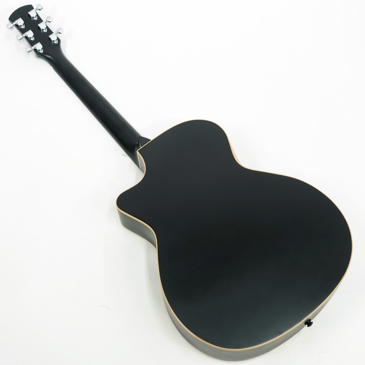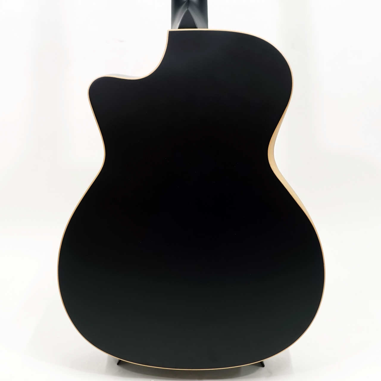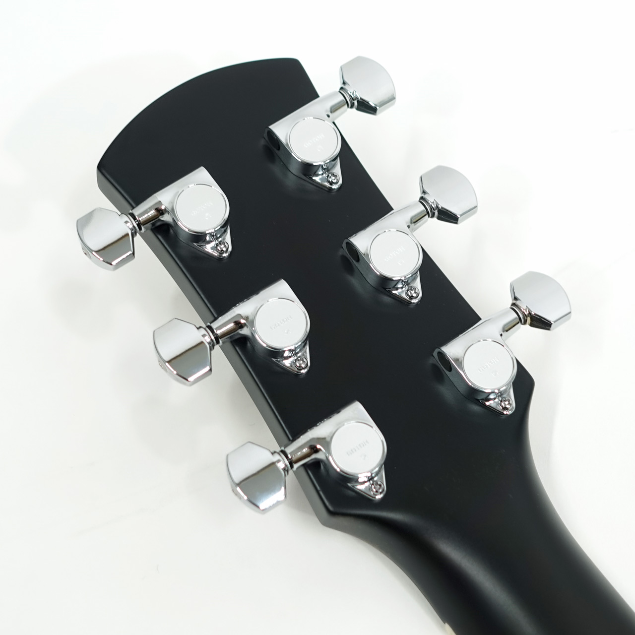 ボディの形状はOMタイプ‧バックコンター付、加えてナット幅は43mmと、⽐較的⼩回りの効くサイズ感なので、初⼼者から上級者まで幅広く活躍できる⼀本です。トップ材はシトカスプルース単板、サイドバック材はアフリカンマホガニー単板を使⽤しております。
