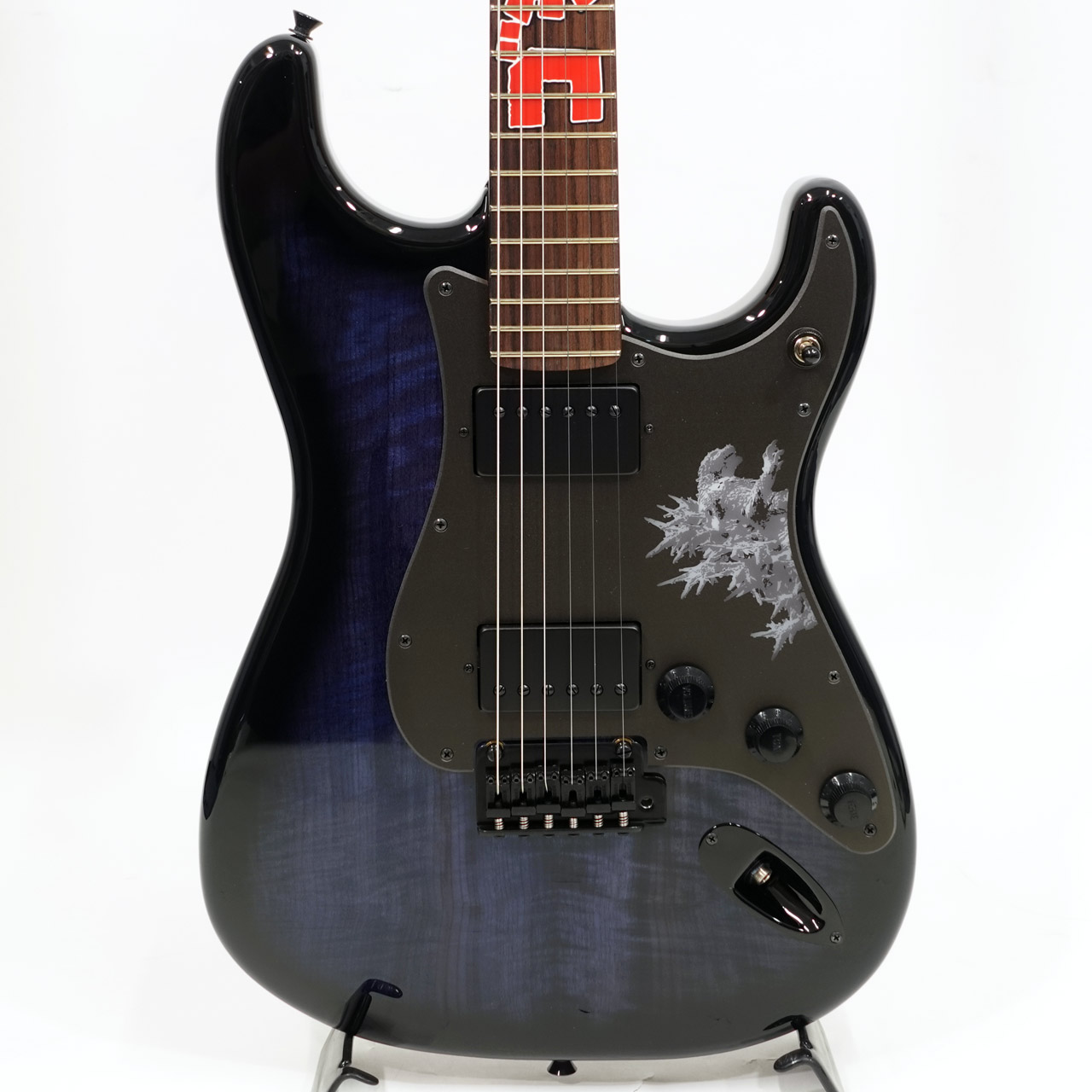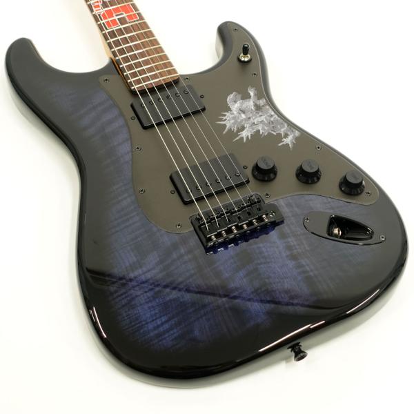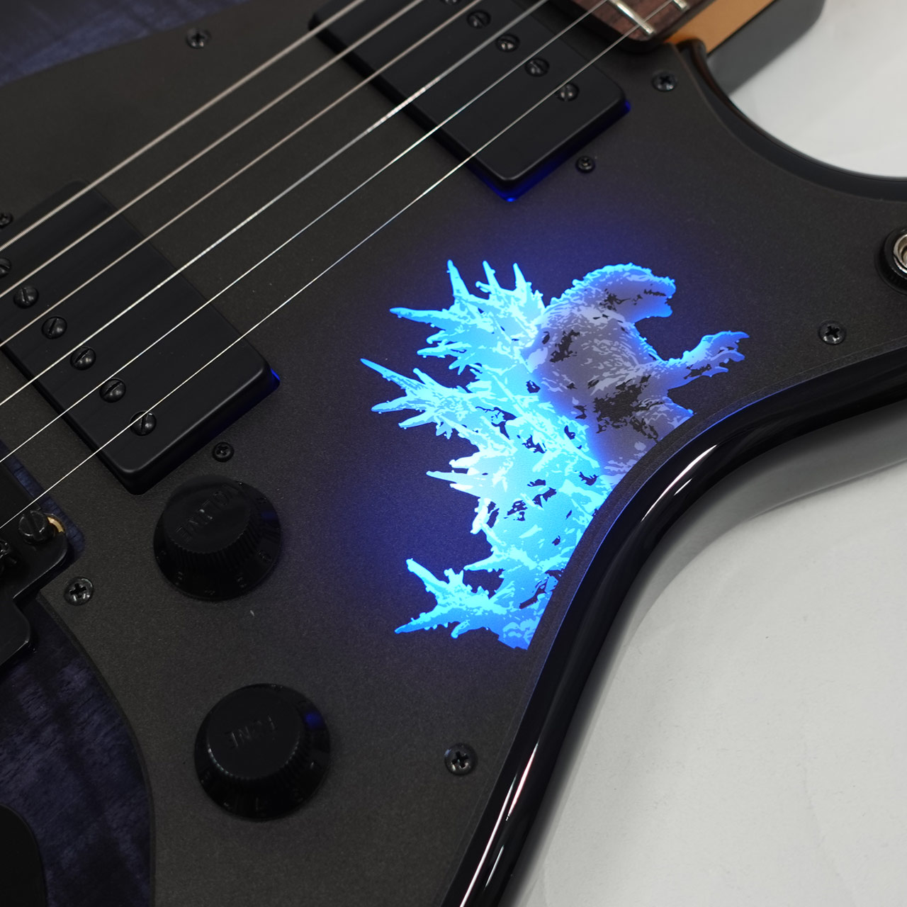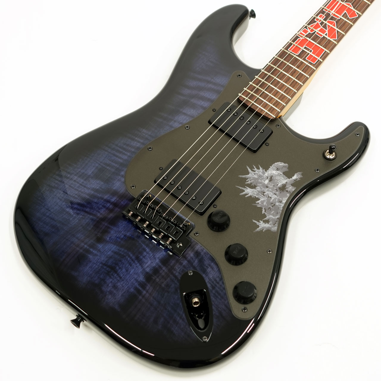 アルダーボディにマートルウッドを貼り合わせ、深みのあるブルーで染色しグロスフィニッシュで仕上げることで、ゴジラならではの重厚な存在感を表現。ネックは“Modern C”シェイプで、22フレット仕様のミディアムジャンボフレットを採用し、指板の12フレット付近には、ゴジラのロゴが大胆にあしらわれており、視覚的にも強いインパクトを与えます。