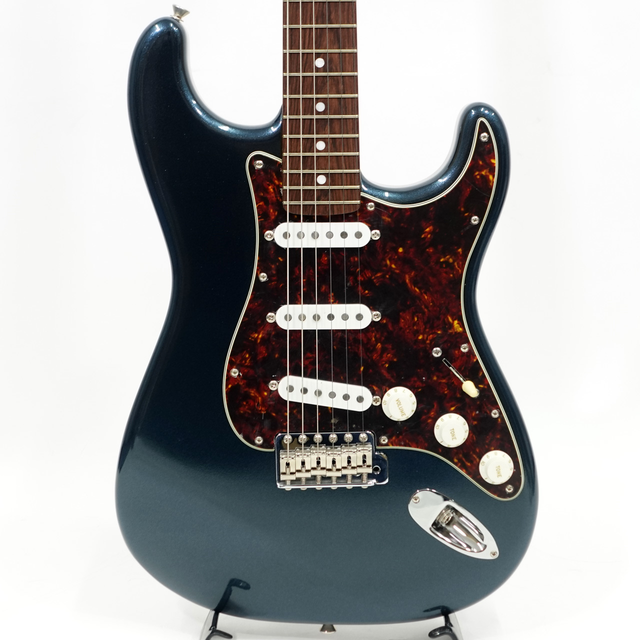 選定された上質なアルダーボディにメルセデスブルーフィニッシュのマッチングヘッド。