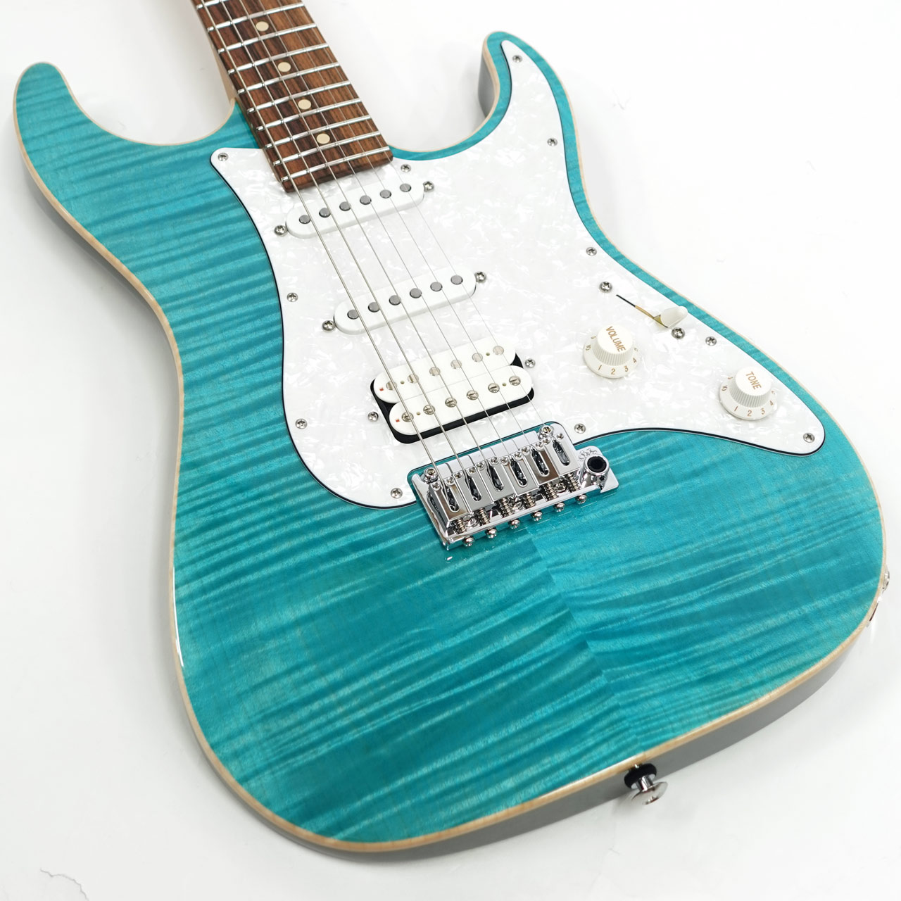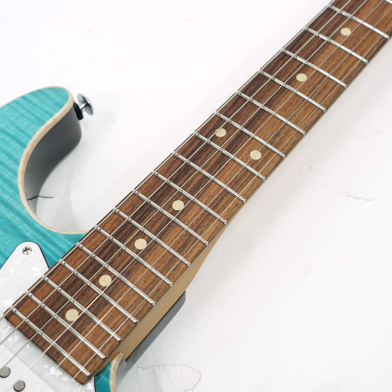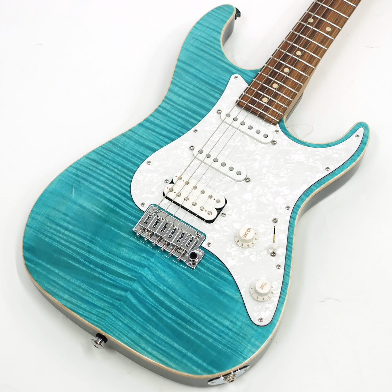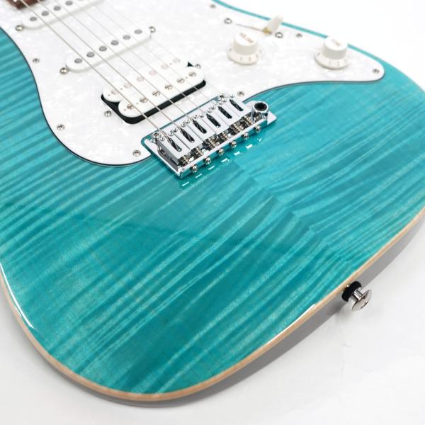 定番のフレイムメイプルトップ/バスウッドボディのコンビネーションに気温や湿度の変化に対する強い耐性、そして特有の鳴りも持ち合わせるローステッドメイプルネックを採用。指板にはパーフェローを採用したコンパウンドラジアス仕様。