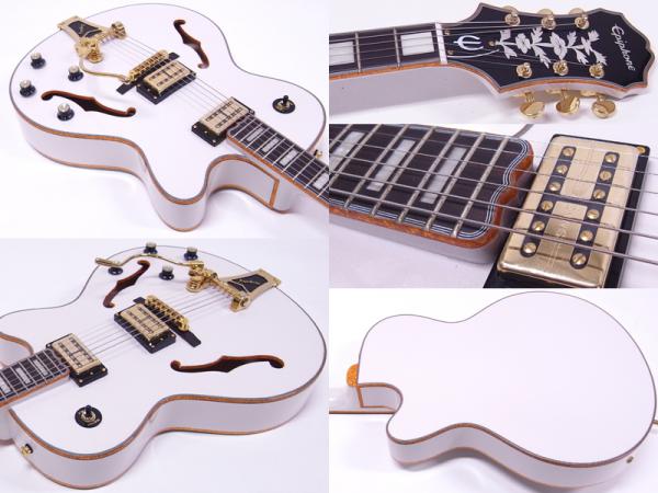 輝くゴールドパーツにゴールドスパークルのバインディング、ビグスビートレモロとゴージャスなルックスに仕上がっています。