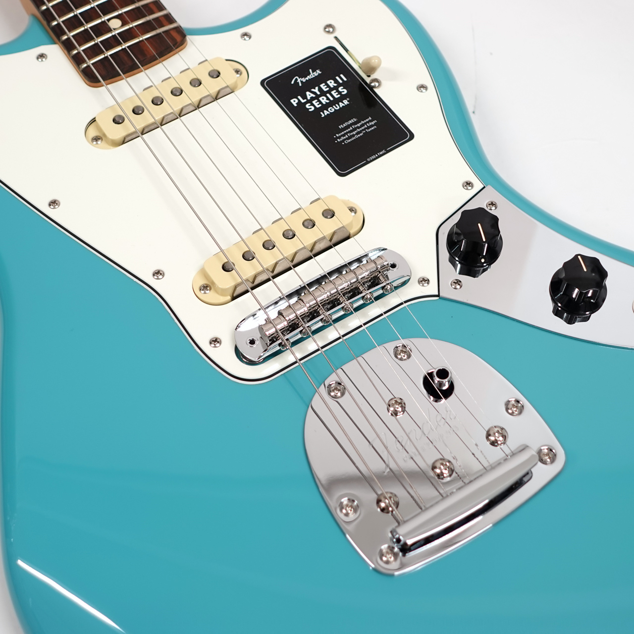クラシックなトーンウッドであるアルダーボディを採用したPlayer II Jaguarは、伝統的なフェンダーフィニッシュ、またはフェンダーのカラーアーカイブから発掘され、本シリーズで初採用となる新フィニッシュなど、幅広いカラーの選択肢をご用意しています。Player Series Alnico V(ブリッジ)とAlnico II(ネック)Single-Coil Jaguarピックアップからはクリスタルのように澄み渡ったネックポジションのクリーントーンとバイト感に溢れるブリッジポジションのサウンドが得られます。3ウェイブレードスイッチにより、多彩なサウンド設計が可能です。フローティングトレモロと、アップグレードされたMustangサドル付き6サドル式Jaguarブリッジと、ClassicGearチューニングマシンによりチューニングの安定性と豊かな表現力が確保され、無限のサウンドの可能性を追求できる柔軟性を備えています。