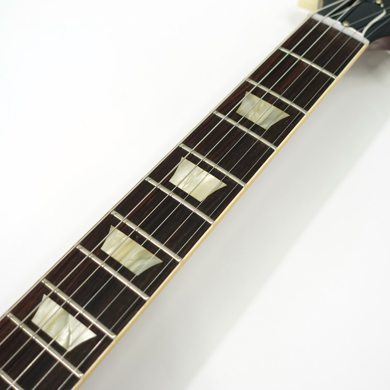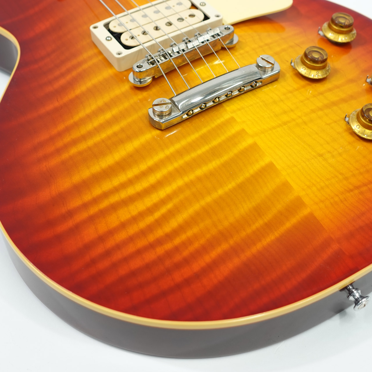 PSLオーダーのウォッシュドチェリーバーストフィニッシュにハンドセレクトフィギャードメイプルトップを採用。弊社スタッフが現地選定したトップ材はギブソンストックの中でもR-Topと呼ばれる美しい杢の出たメイプルトップを採用。