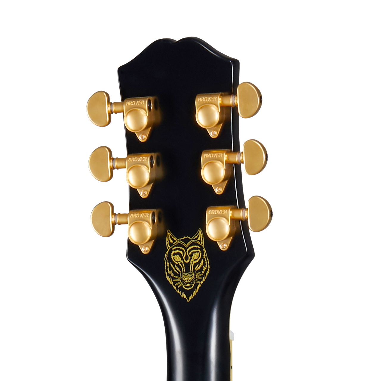 つや消しのエイジドブラックに、つや消しのゴールドパーツ仕様がオーソドックスなセミアコスタイルながらどこにも無いビンテージ感たっぷりの雰囲気を漂わせる個性的ルックスに仕上がっています。