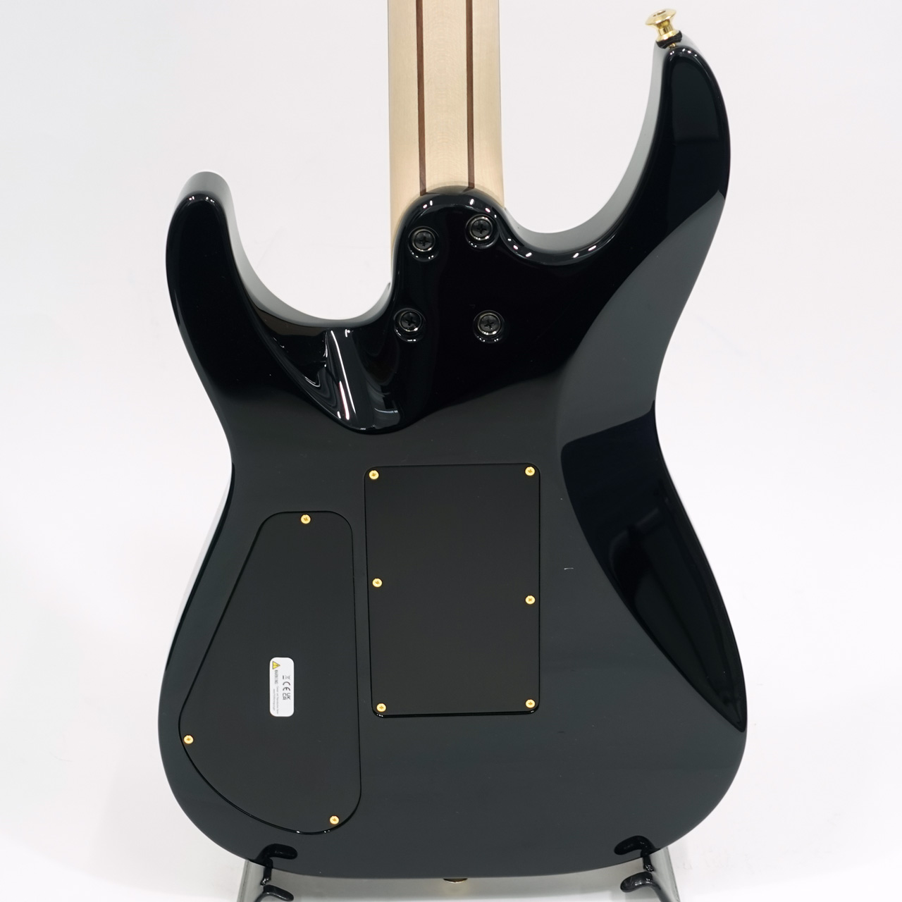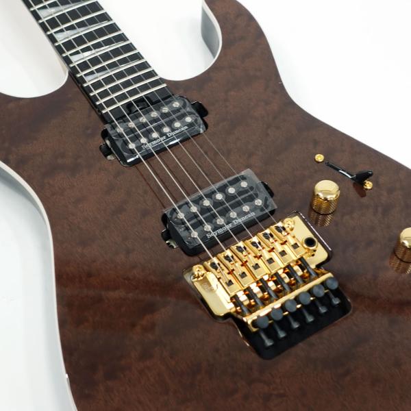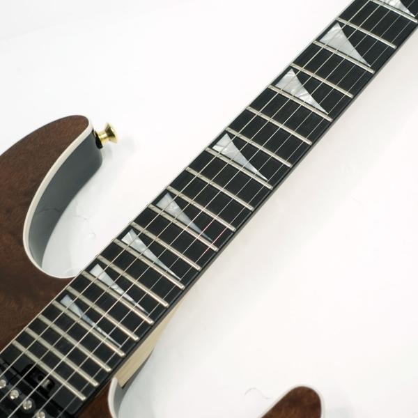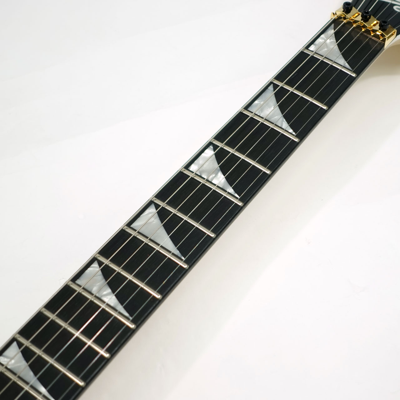 メイプル/ウォールナット/メイプルの5ピースネックは、気候による反りに対する安定性を高めるためにグラファイト補強材を内蔵しボルトオンされており、滑らかな演奏性を実現するために背面にはオイル仕上げが施されています。エッジのロールオフ処理、24ジャンボフレット、パーロイドシャークフィンインレイを備えた12〜16インチコンパウンドラジアス仕様のエボニーフィンガーボードは、ローポジションでのコード弾きからハイポジションでのソロプレイをスムーズにサポート。暗いステージでも視認性を確保したLuminlayサイドドットを採用し、ネックエンド
