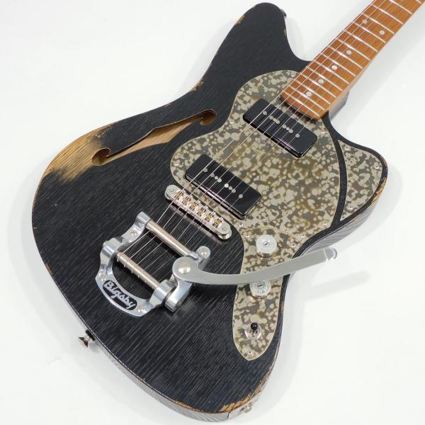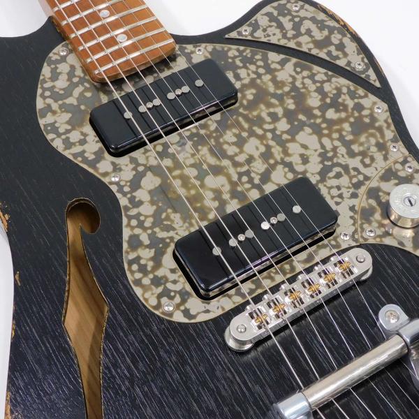 ボディ材にエイジドチェスナットをFホール搭載のオフセットセミホロウボディにて採用。チェスナットはアッシュに似たような杢目がはっきりと出る見た目ですが、中域の太さ、高域の鋭さを備えギター用材としても優れています。
